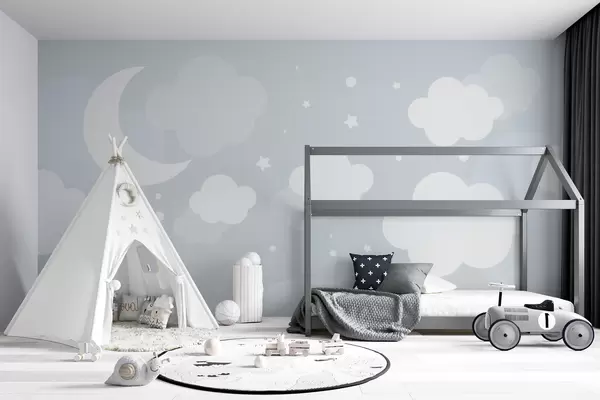 Fototapetes Cute tapetes ar mākoņiem, zvaigznēm un mēnesi uz zila fona Nr. u97510