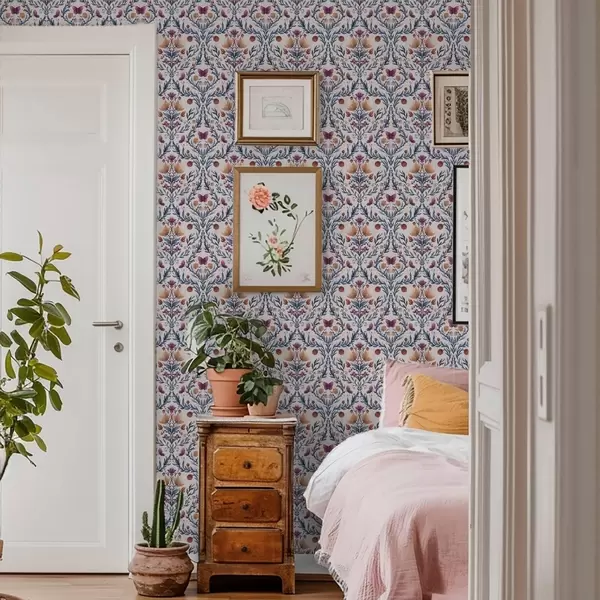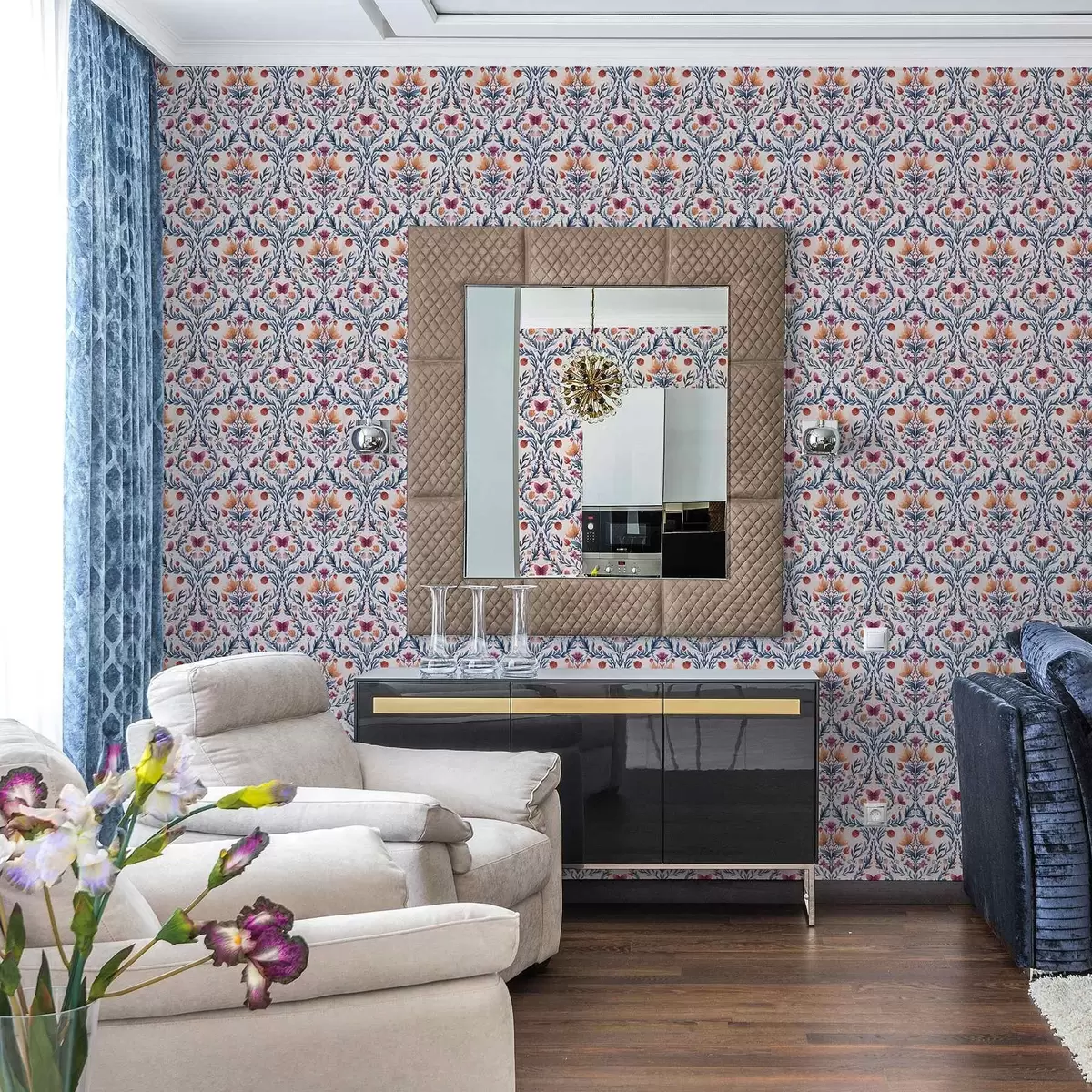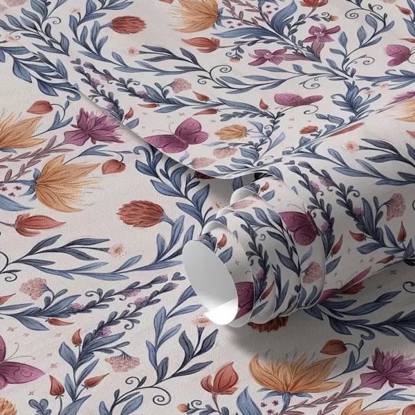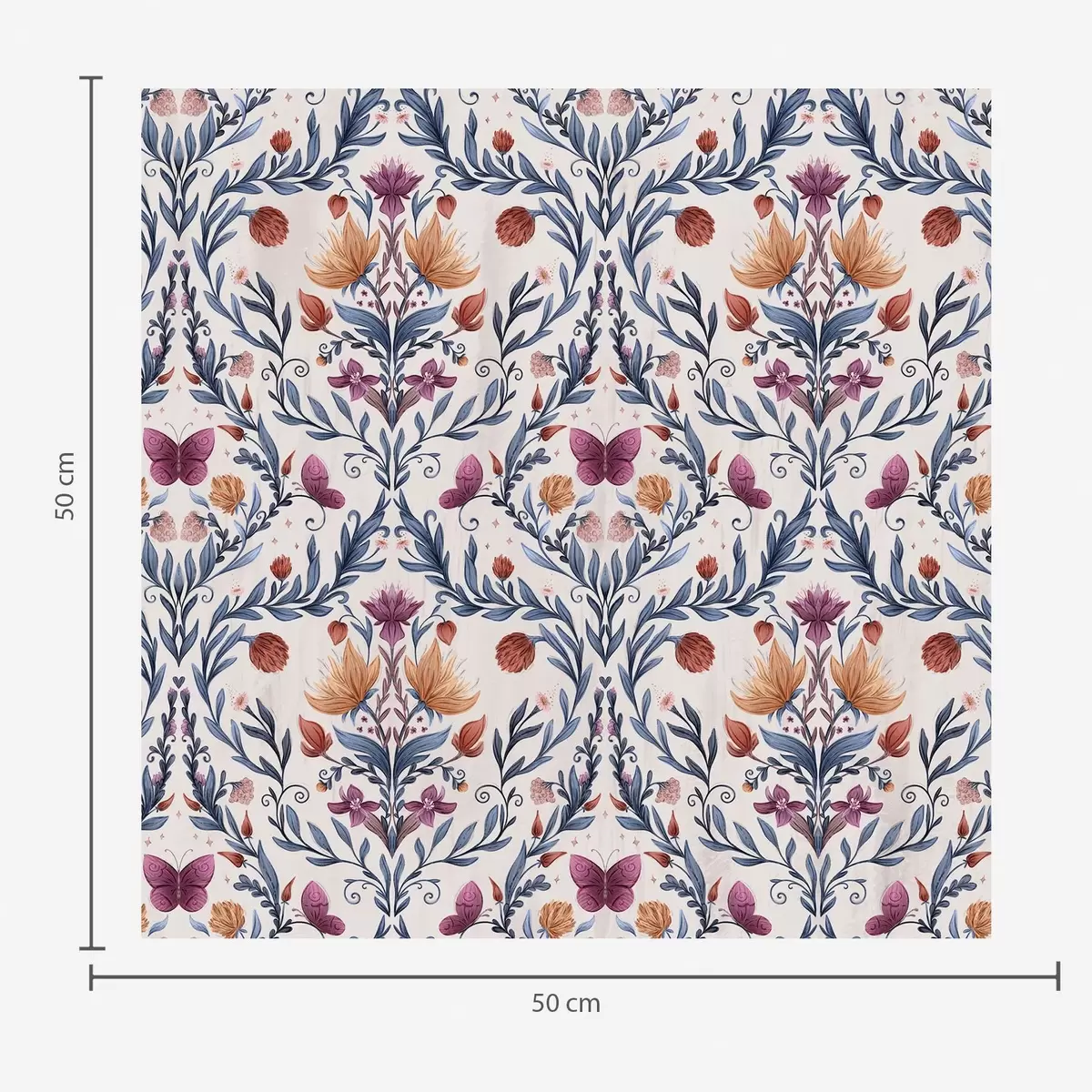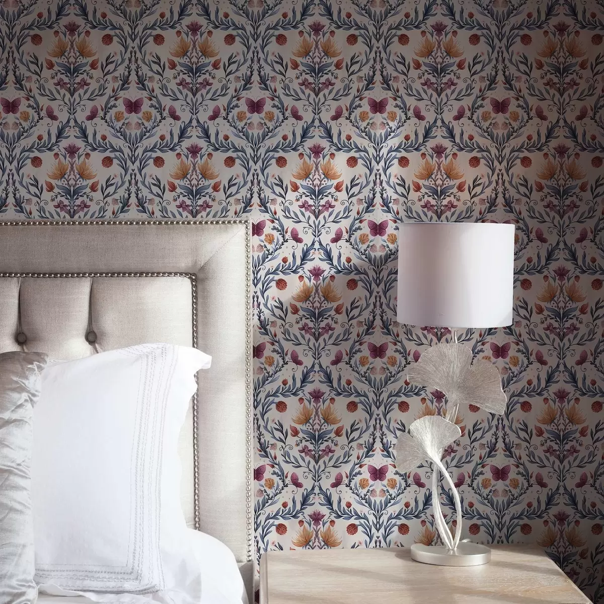 Tapetes Ziedu damasts ar tauriņiem tumši zilas un terakotas krāsā uz balta fona Nr. a00926v1