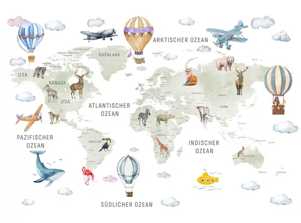 Fototapetes Bērnu karte akvareļu stilā ar dzīvniekiem un karstā gaisa baloniem. Vācu valoda. Zaļā krāsā Nr. c00001de