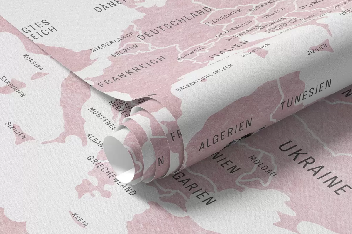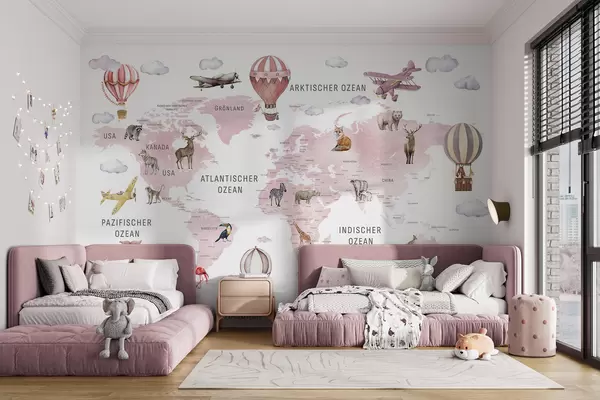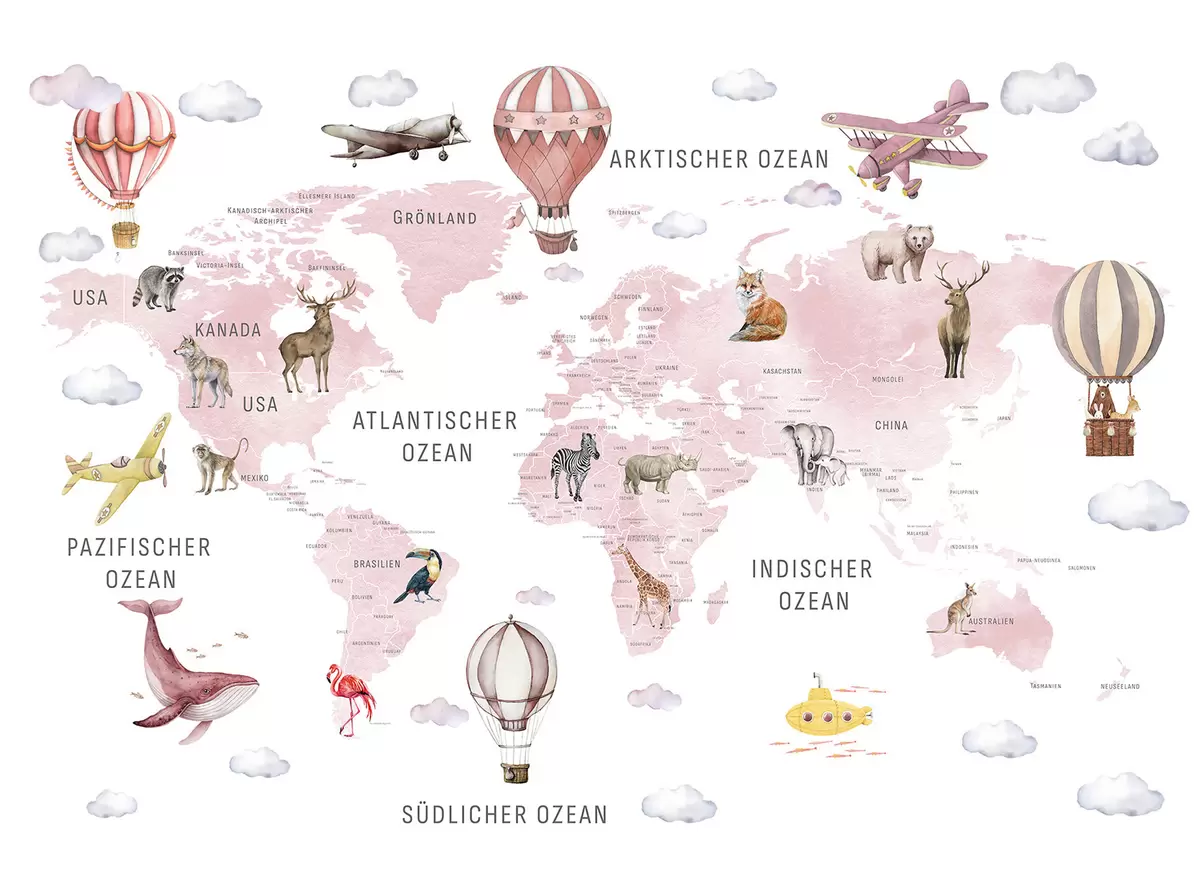 Fototapetes Bērnu karte akvareļu stilā ar dzīvniekiem un karstā gaisa baloniem. Vācu valoda. Rozā krāsa. Nr. c00001dev3