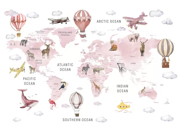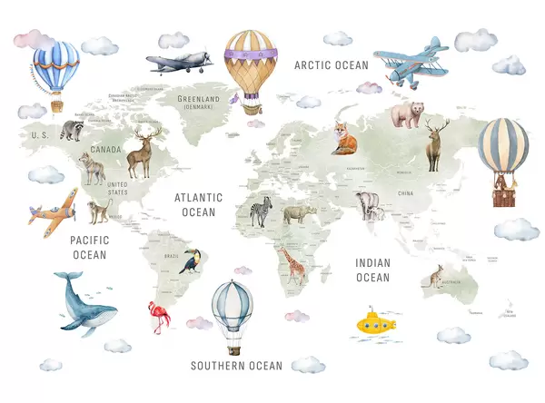Fototapetes Bērnu karte akvareļu stilā ar dzīvniekiem un karstā gaisa baloniem. Angļu valoda. Bēša krāsa. Nr. c00001env2
