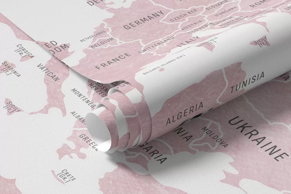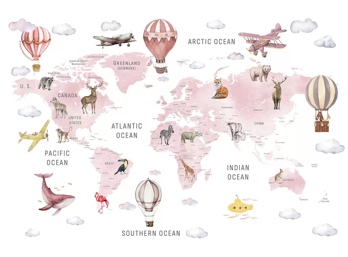 Fototapetes Bērnu karte akvareļu stilā ar dzīvniekiem un karstā gaisa baloniem. Angļu valoda. Rozā krāsa. Nr. c00001env3