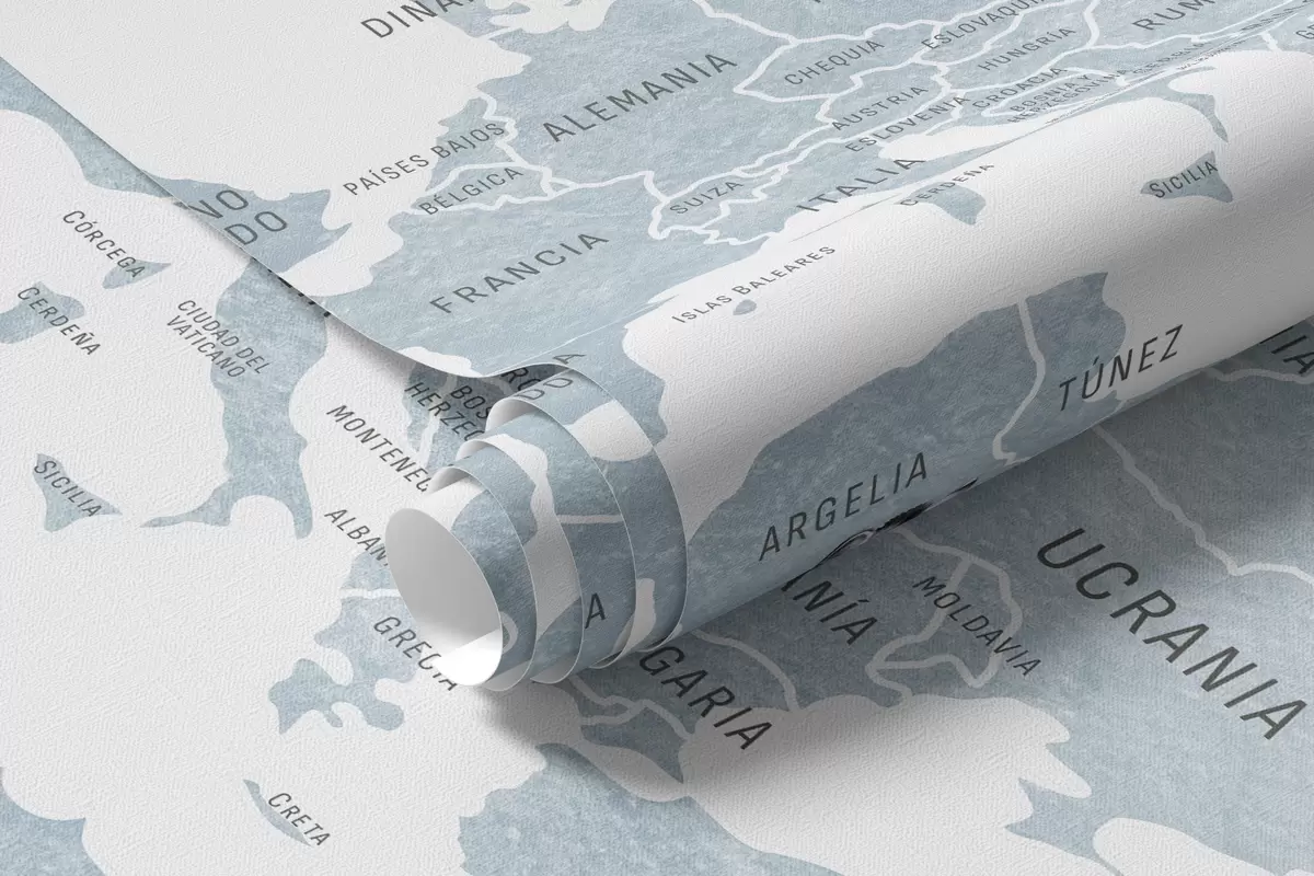 Fototapetes Bērnu karte akvareļu stilā ar dzīvniekiem un karstā gaisa baloniem. Spāņu valoda. Zila krāsa. Nr. c00001esv1