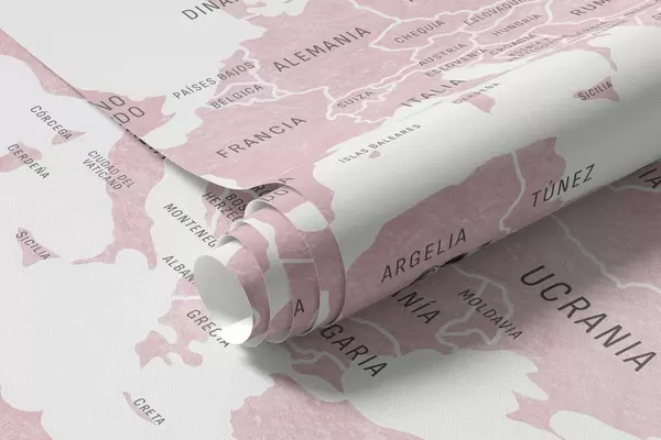Fototapetes Bērnu karte akvareļu stilā ar dzīvniekiem un karstā gaisa baloniem. Spāņu valoda. Rozā krāsa. Nr. c00001esv3