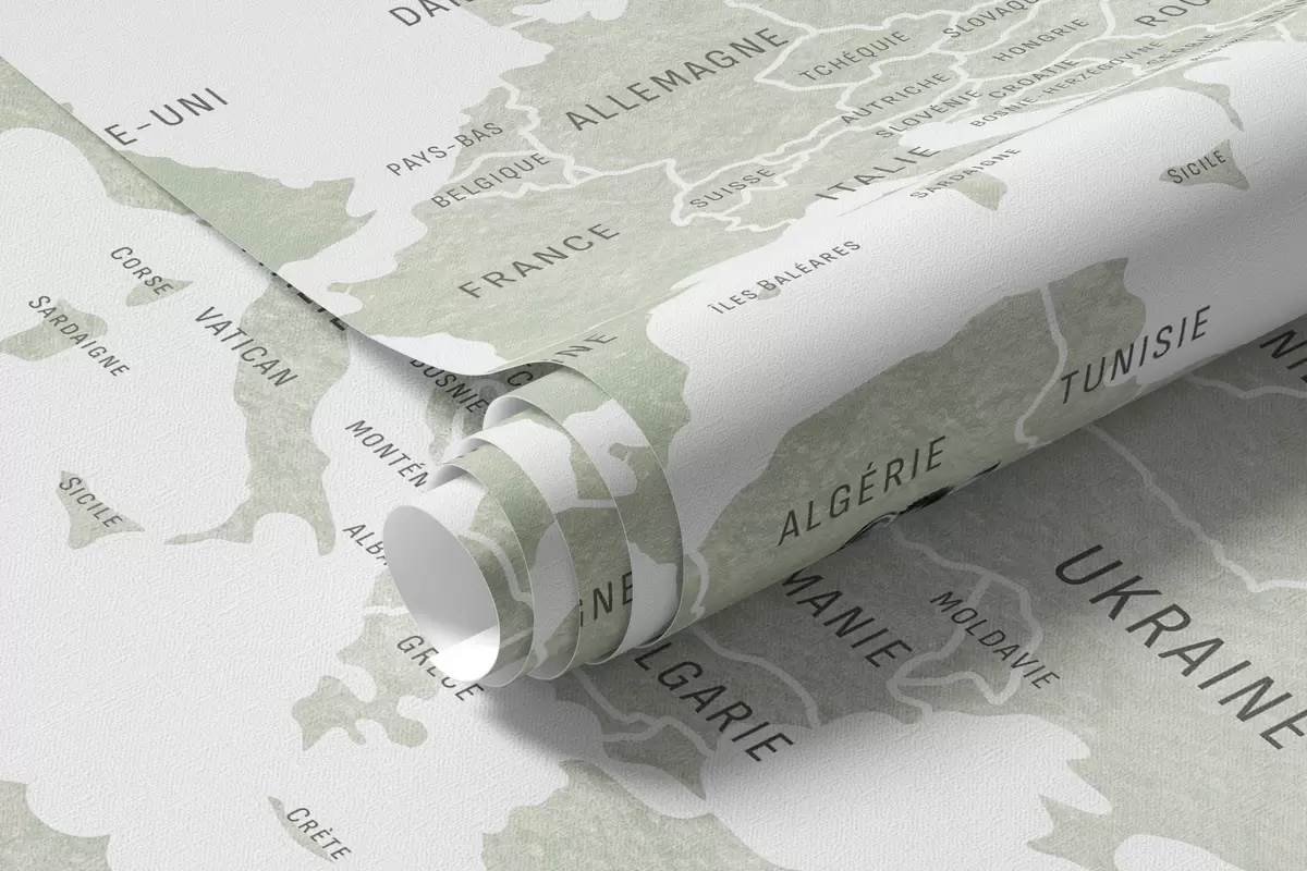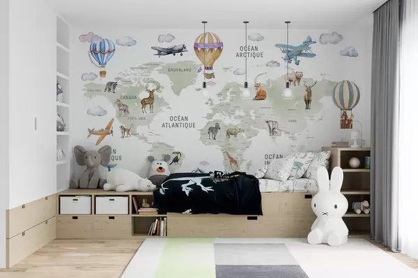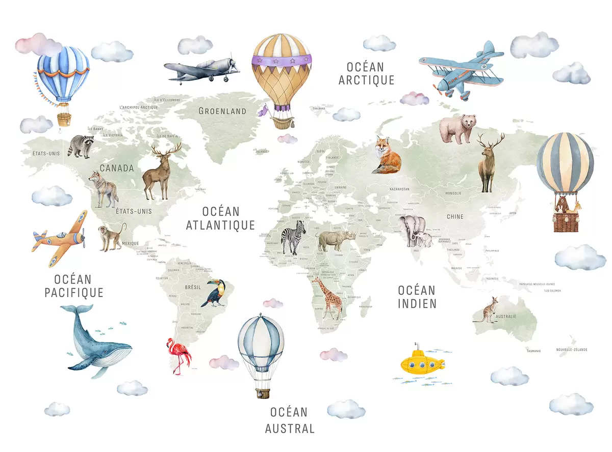 Fototapetes Bērnu karte akvareļu stilā ar dzīvniekiem un karstā gaisa baloniem. Franču valoda. Zaļa krāsa Nr. c00001fr
