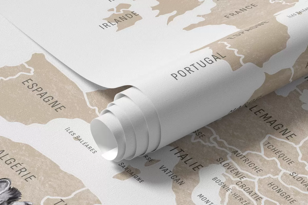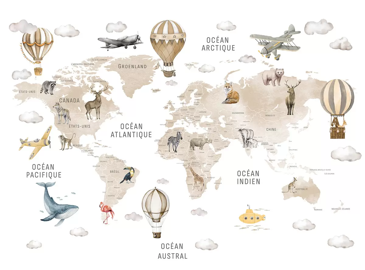 Fototapetes Bērnu karte akvareļu stilā ar dzīvniekiem un gaisa baloniem. Franču valoda. Bēša krāsa. Nr. c00001frv2