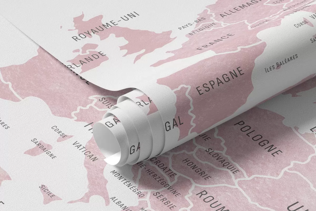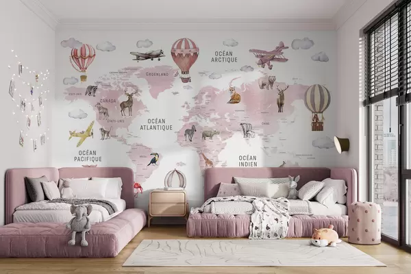 Fototapetes Bērnu karte akvareļu stilā ar dzīvniekiem un gaisa baloniem. Franču valoda. Rozā krāsa. Nr. c00001frv3