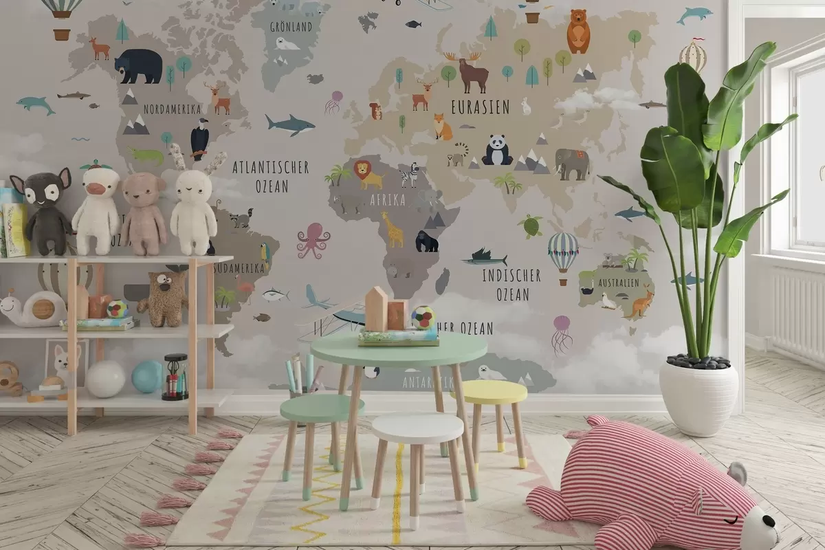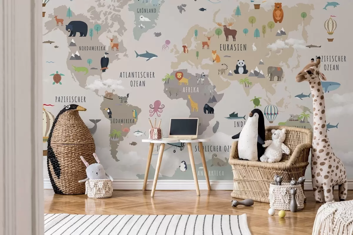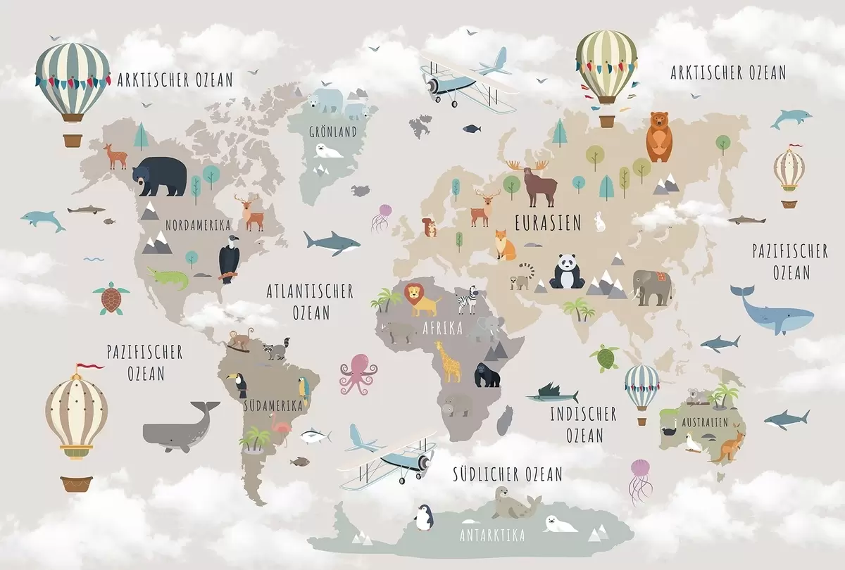 Fototapetes Bērnu pasaules karte ar dzīvniekiem un karstā gaisa baloniem. Vācu valoda Nr. c00002de