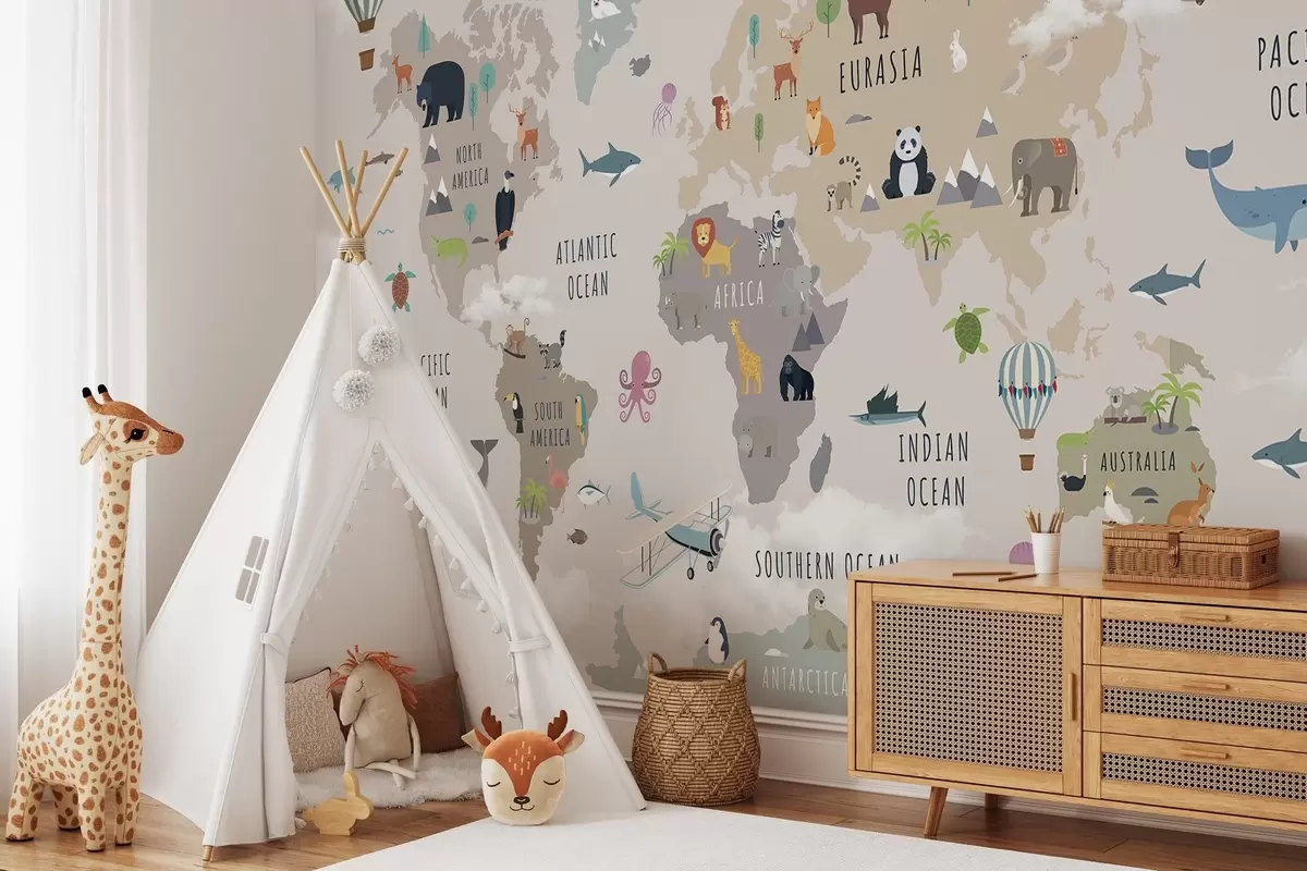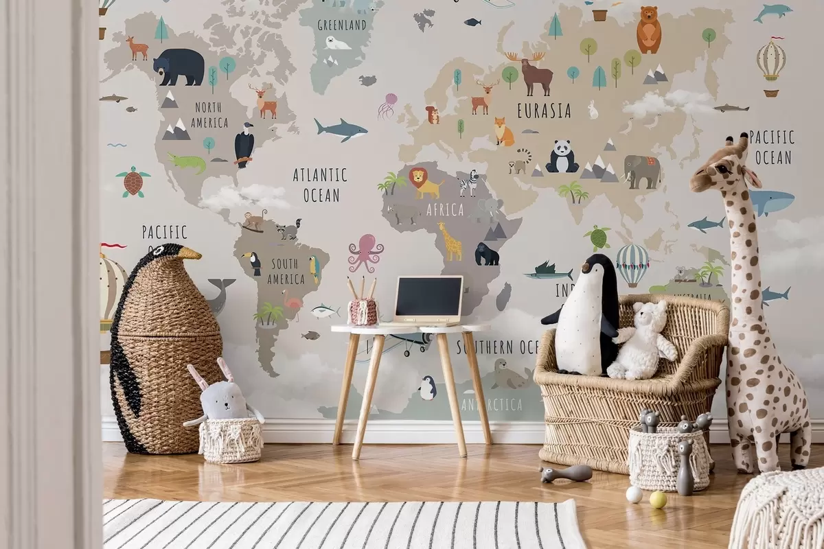 Fototapetes Bērnu pasaules karte ar dzīvniekiem un karstā gaisa baloniem. Angļu valoda Nr. c00002en