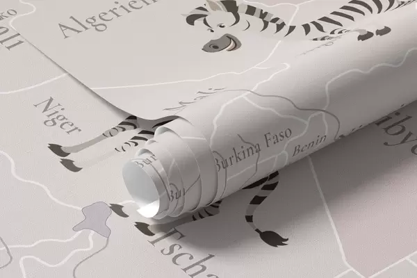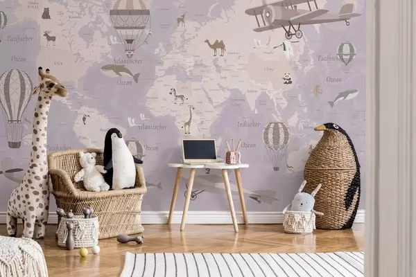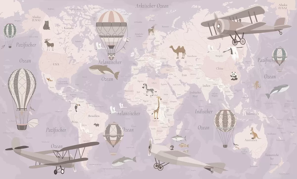 Fototapetes Bērnu pasaules karte ar dzīvniekiem, lidmašīnām un gaisa baloniem. Vācu valoda. Violeta krāsa Nr. c00003dev4
