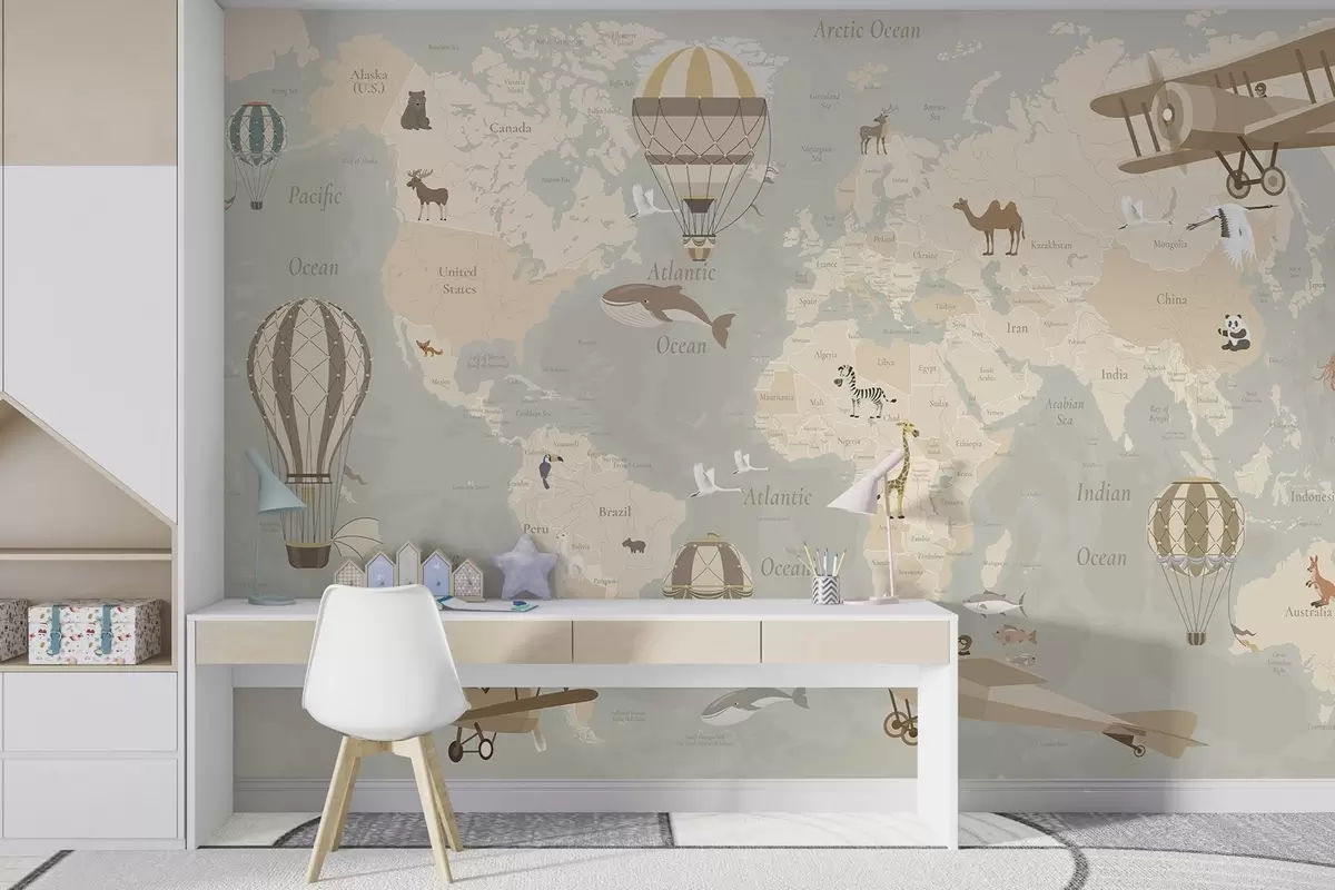 Fototapetes Bērnu pasaules karte ar dzīvniekiem, lidmašīnām un karstā gaisa baloniem. Angļu valoda. Bēša krāsa Nr. c00003en