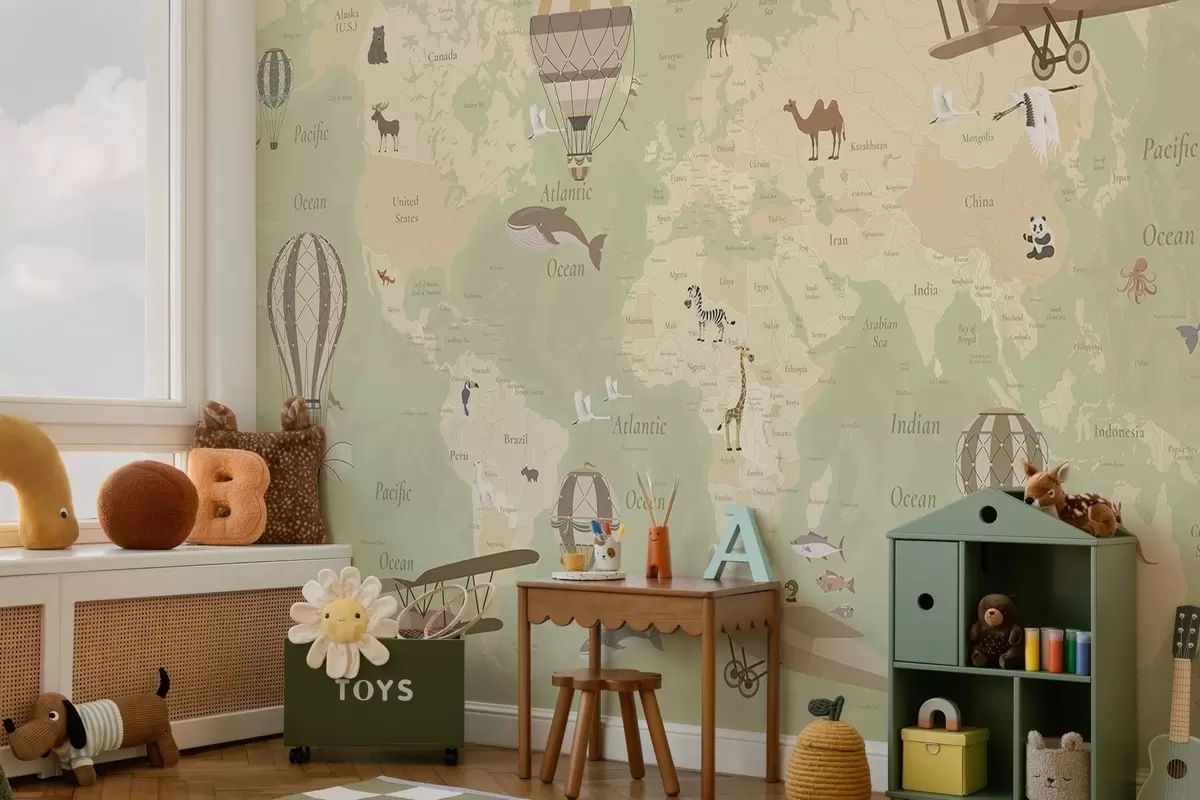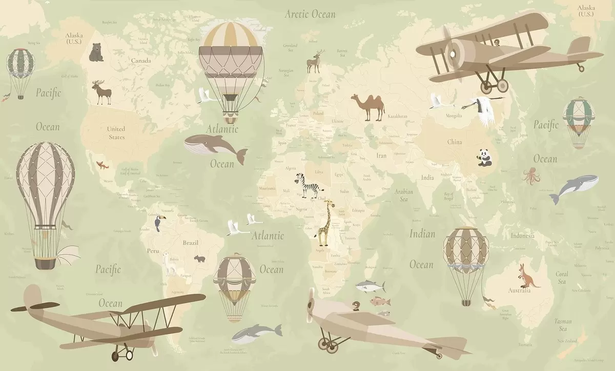 Fototapetes Bērnu pasaules karte ar dzīvniekiem, lidmašīnām un karstā gaisa baloniem. Angļu valoda. Zaļā krāsa Nr. c00003env2