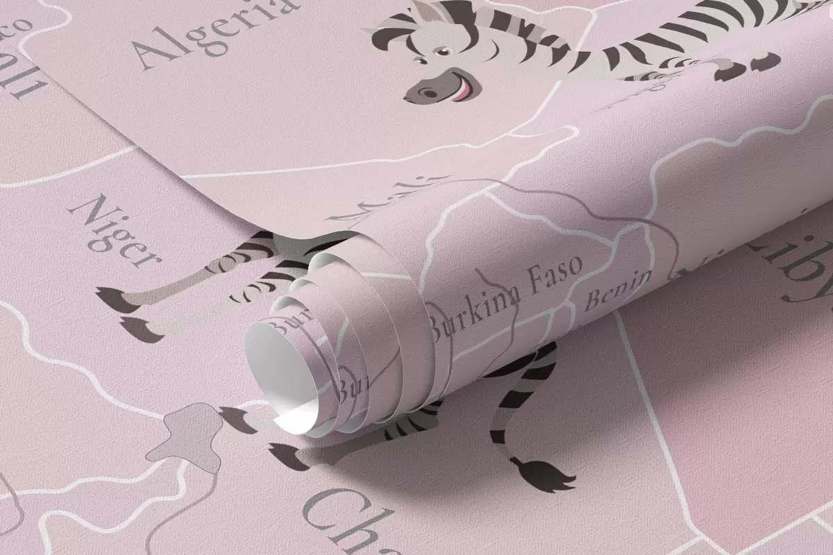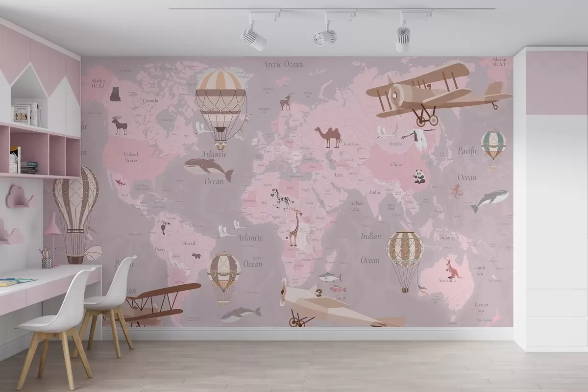 Fototapetes Bērnu pasaules karte ar dzīvniekiem, lidmašīnām un karstā gaisa baloniem. Angļu valoda. Rozā krāsa Nr. c00003env3
