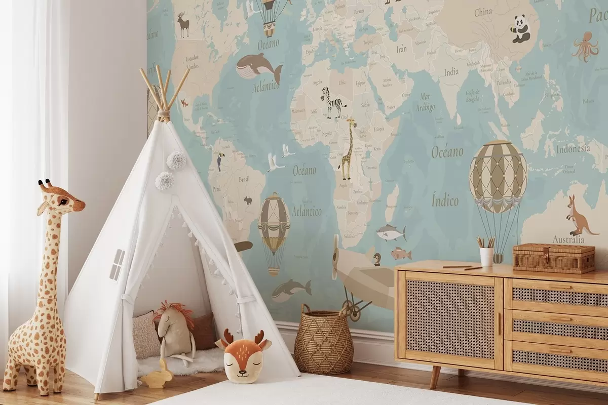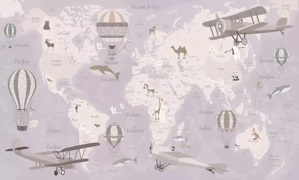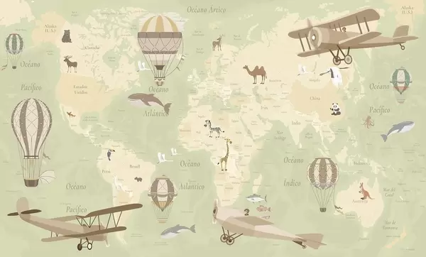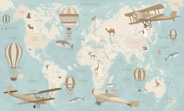 Fototapetes Bērnu pasaules karte ar dzīvniekiem, lidmašīnām un karstā gaisa baloniem. Spāņu valoda. Zila krāsa Nr. c00003esv1
