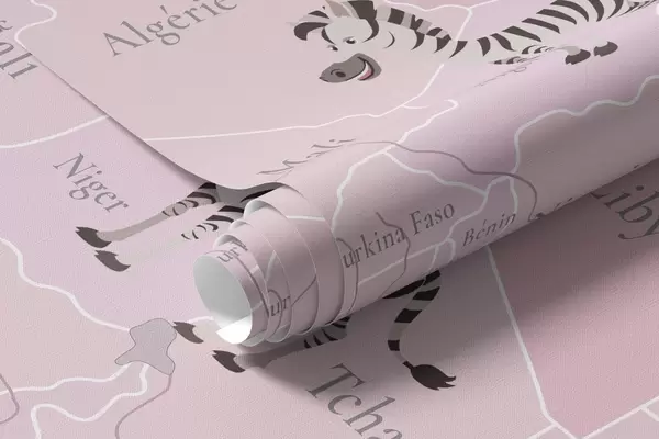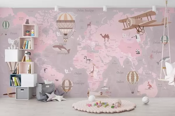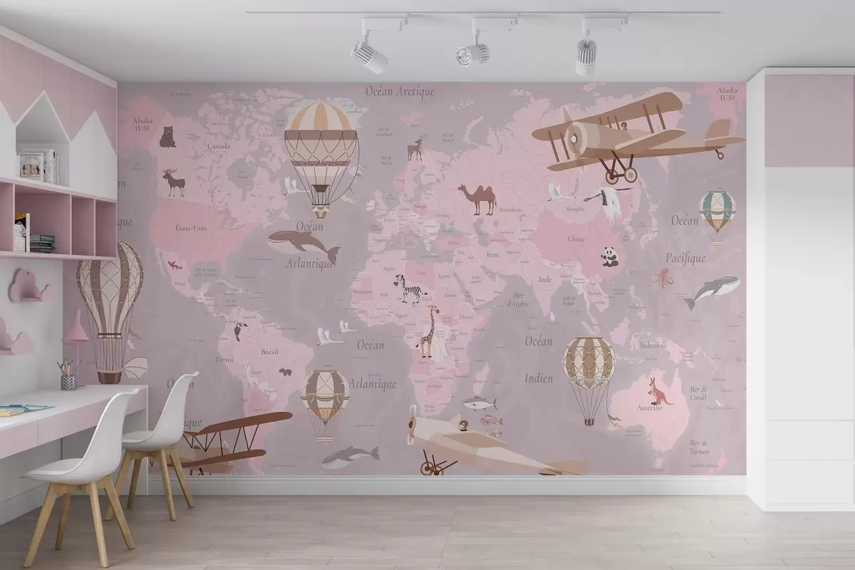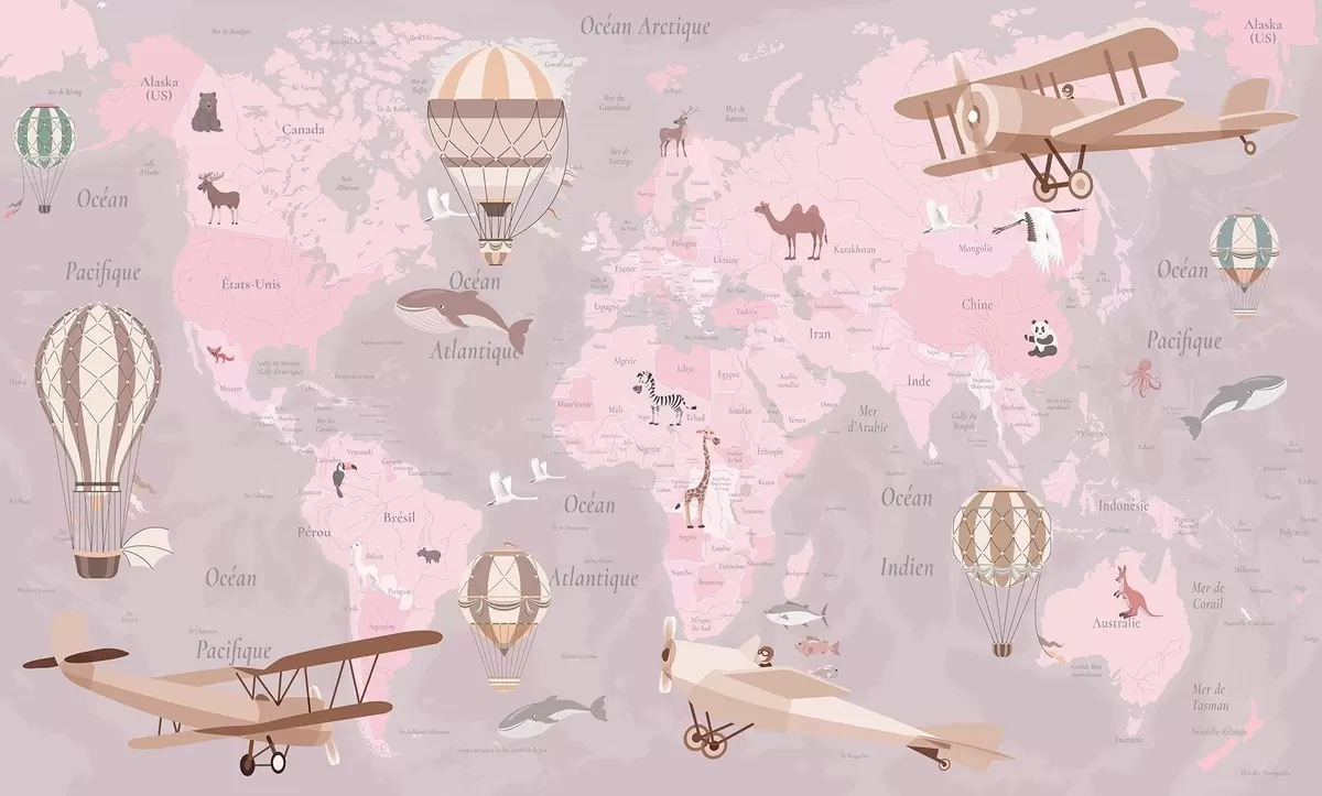 Fototapetes Bērnu pasaules karte ar dzīvniekiem, lidmašīnām un karstā gaisa baloniem. Franču valoda. Rozā krāsa Nr. c00003frv3