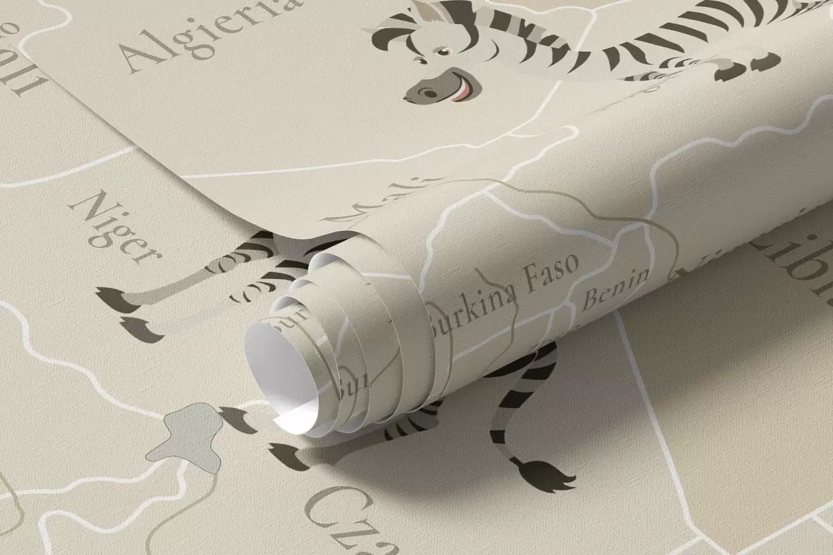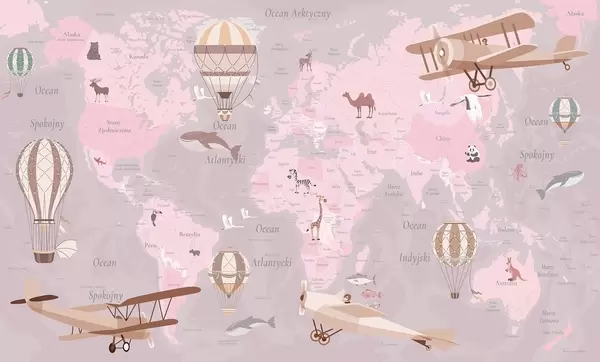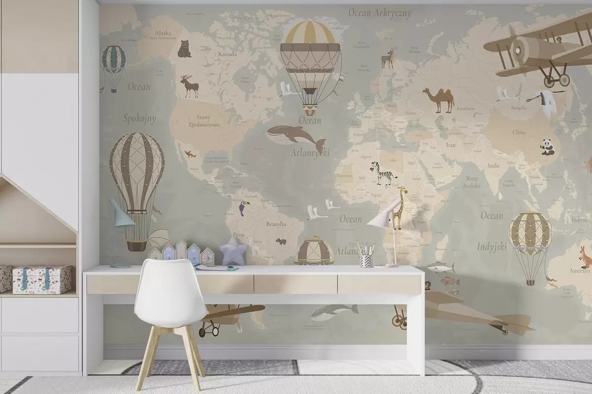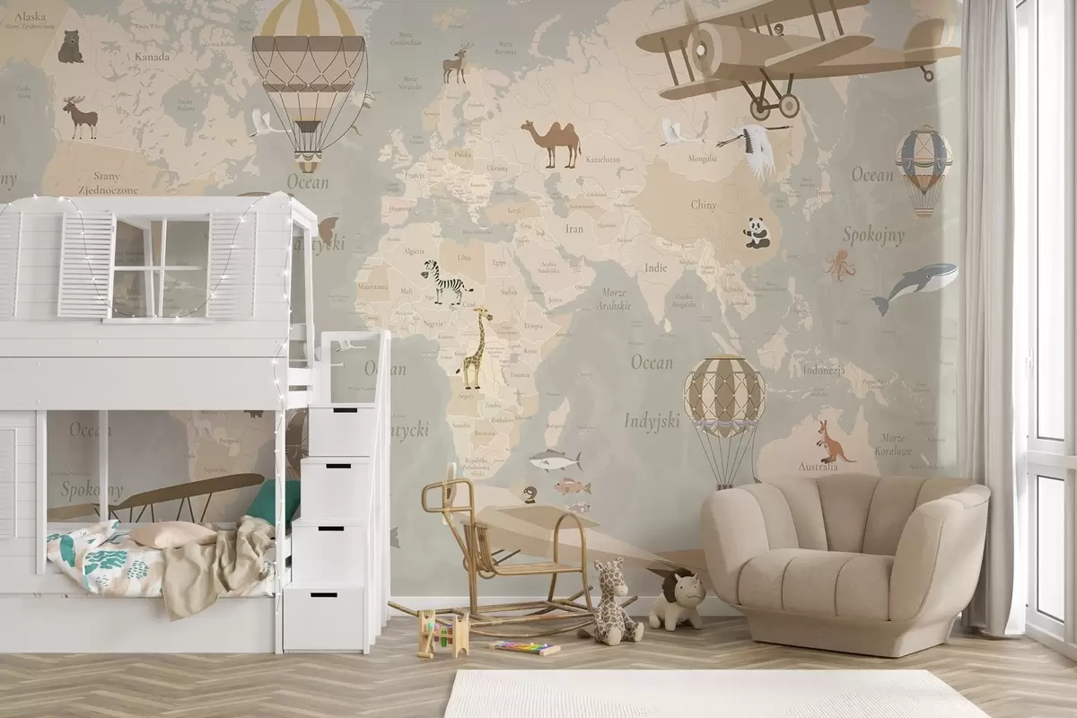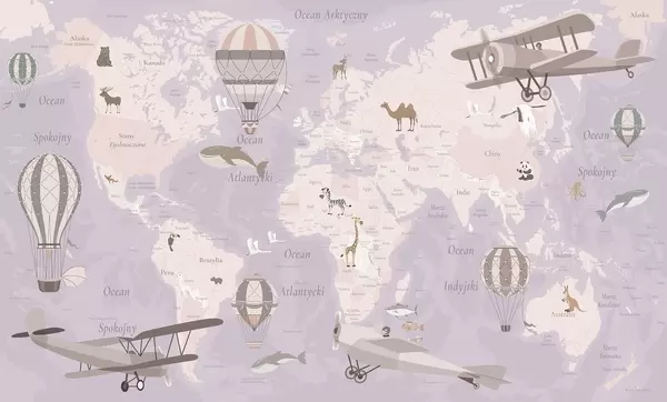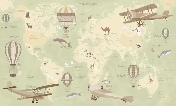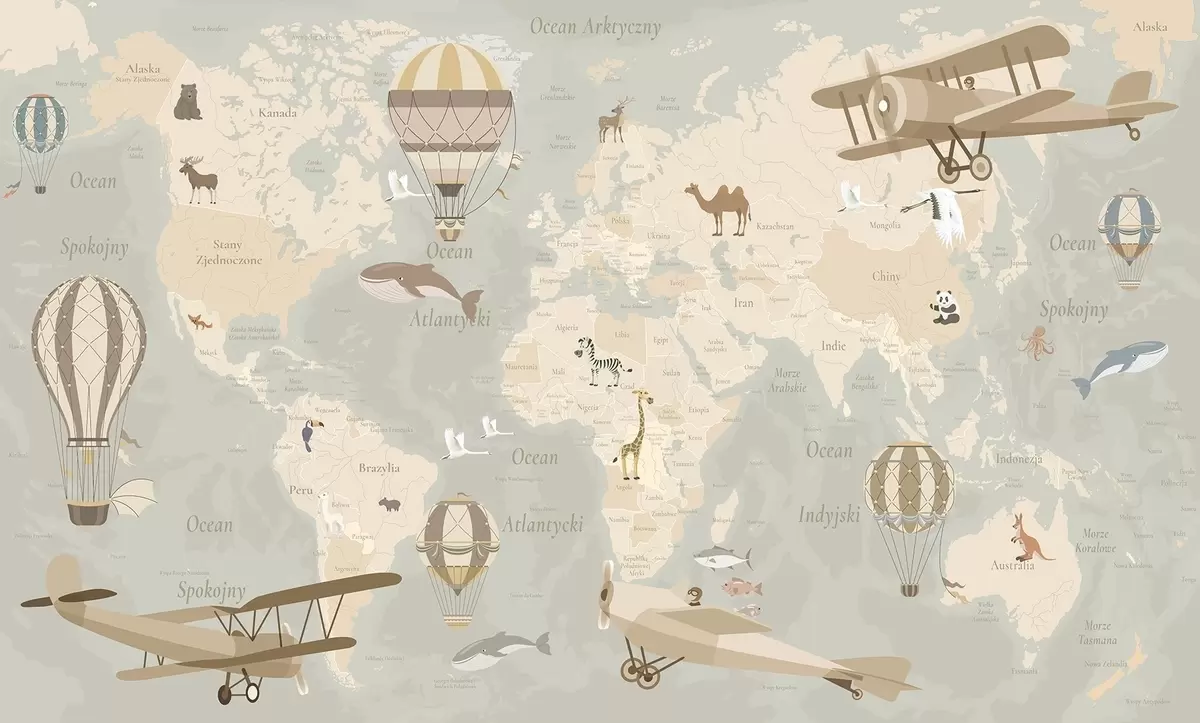 Fototapetes Bērnu pasaules karte ar dzīvniekiem, lidmašīnām un karstā gaisa baloniem. Poļu valoda. Bēša krāsa Nr. c00003pl