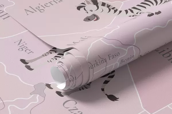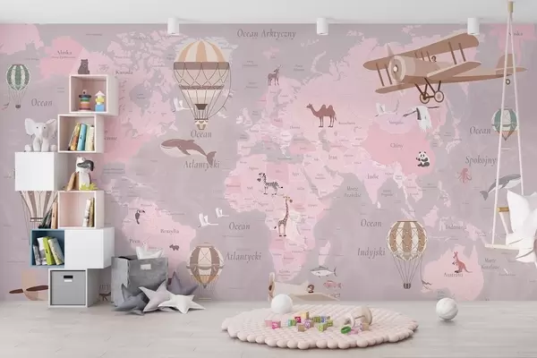 Fototapetes Bērnu pasaules karte ar dzīvniekiem, lidmašīnām un karstā gaisa baloniem. Poļu valoda. Rozā krāsa Nr. c00003plv3