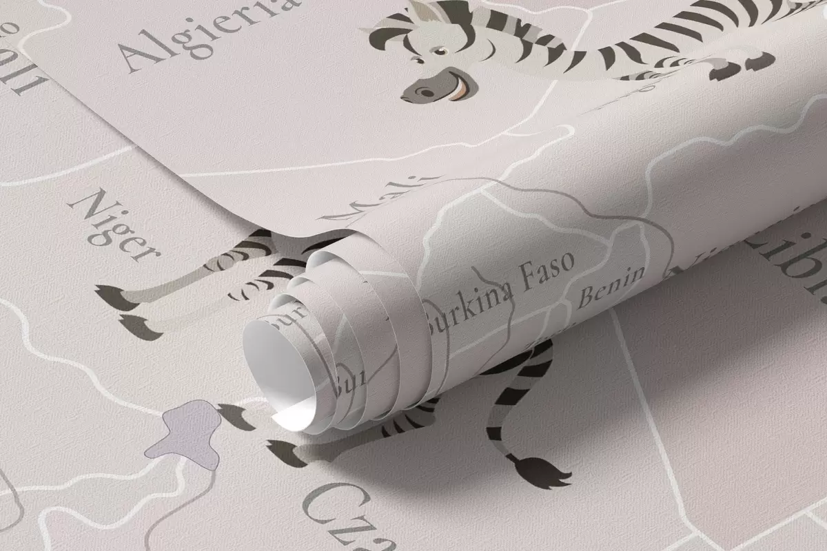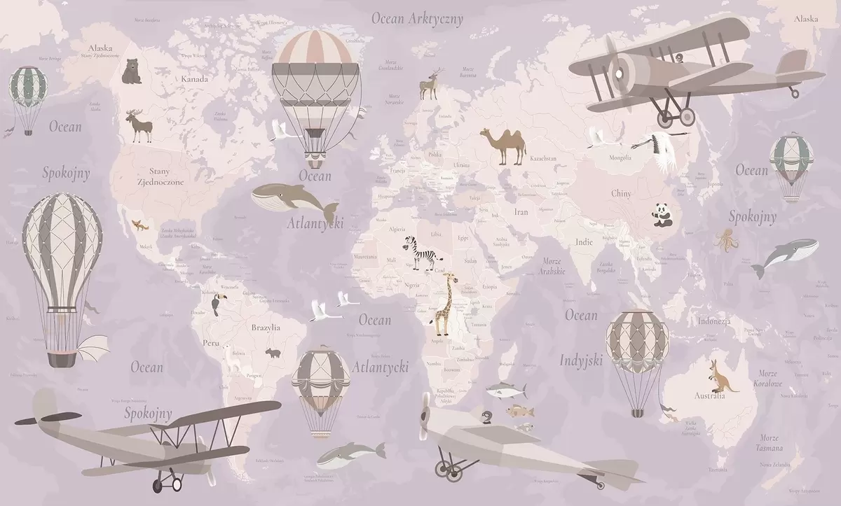 Fototapetes Bērnu pasaules karte ar dzīvniekiem, lidmašīnām un karstā gaisa baloniem. Poļu valoda. Violeta krāsa Nr. c00003plv4