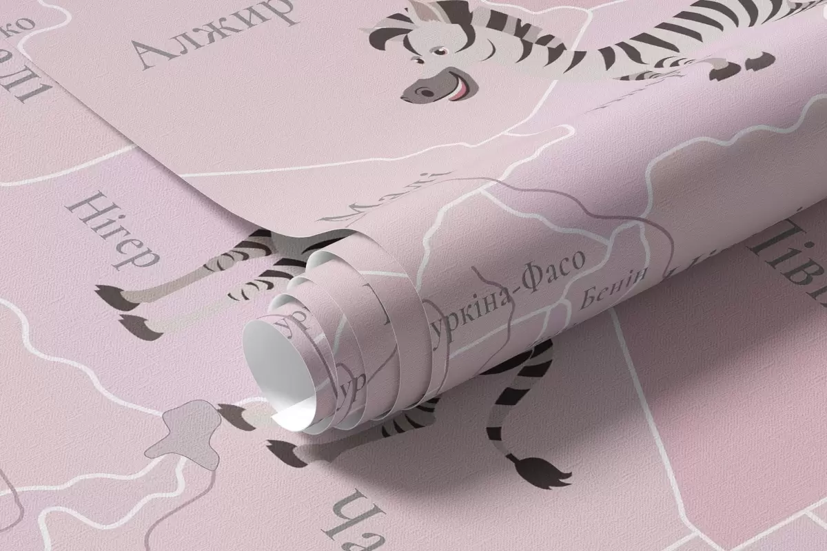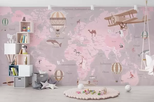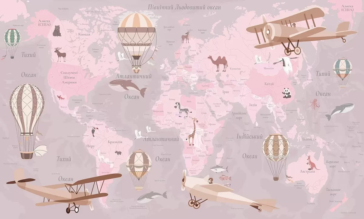 Fototapetes Bērnu pasaules karte ar dzīvniekiem, lidmašīnām un karstā gaisa baloniem. Ukraiņu valoda. Rozā krāsa Nr. c00003ukv3