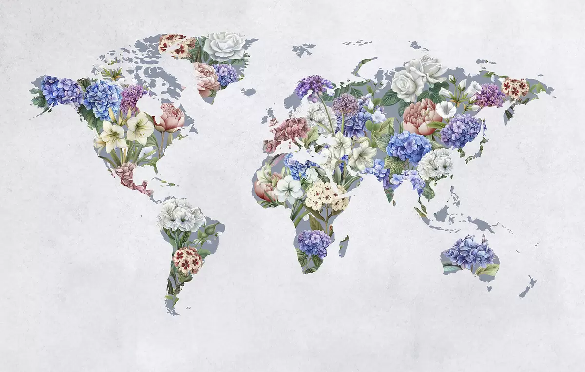 Fototapetes Krāsaina pasaules karte, kas veidota no dažādām košām puķēm Nr. c00006
