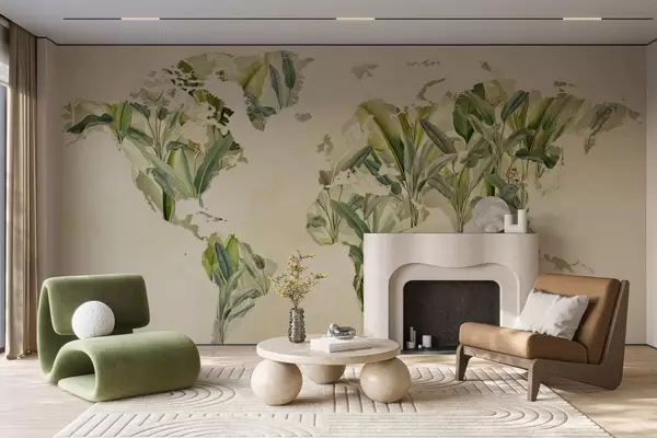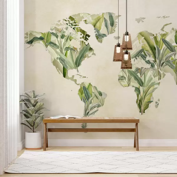 Fototapetes Zaļā pasaules karte, kas izgatavota no banānu lapām Nr. c00007