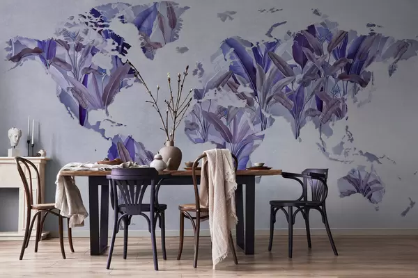 Fototapetes No banānu lapām veidota violeta pasaules karte Nr. c00007v1