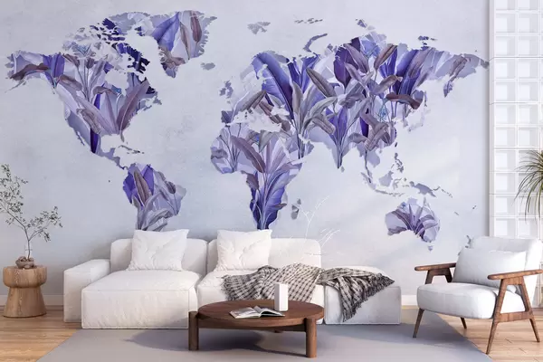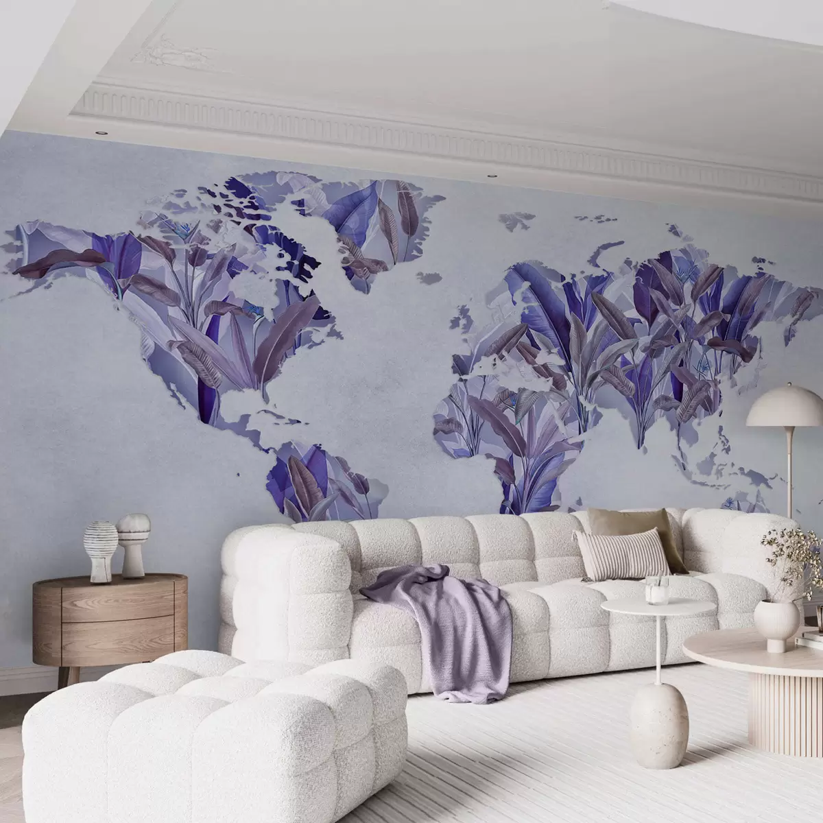 Fototapetes No banānu lapām veidota violeta pasaules karte Nr. c00007v1
