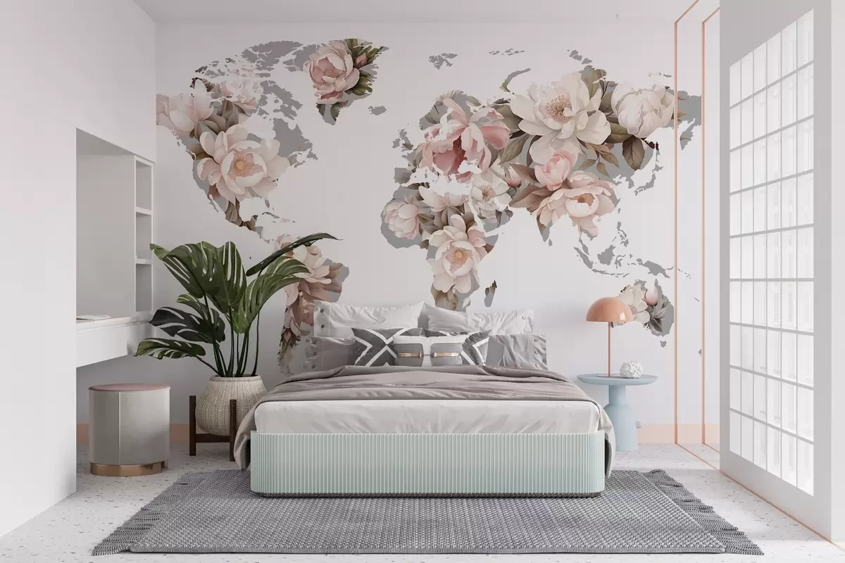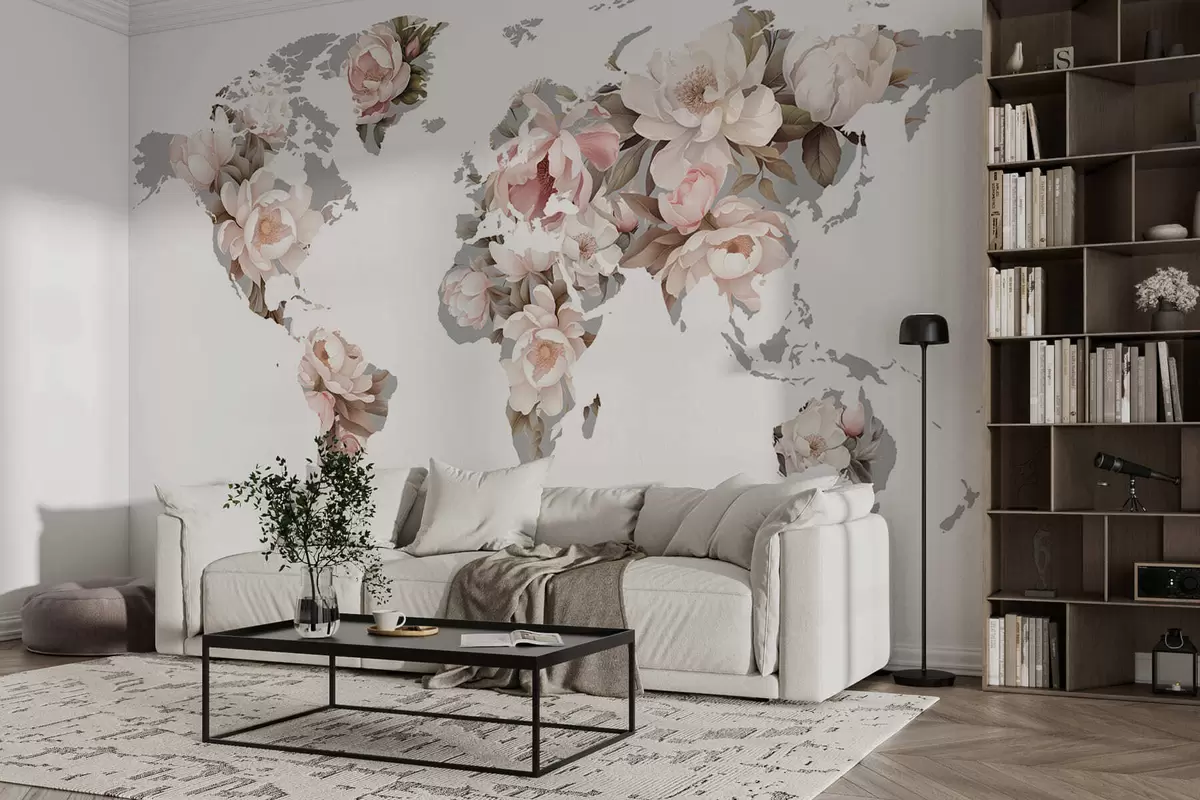 Fototapetes Maiga, krēmveida pasaules karte, kas veidota no ziediem Nr. c00008