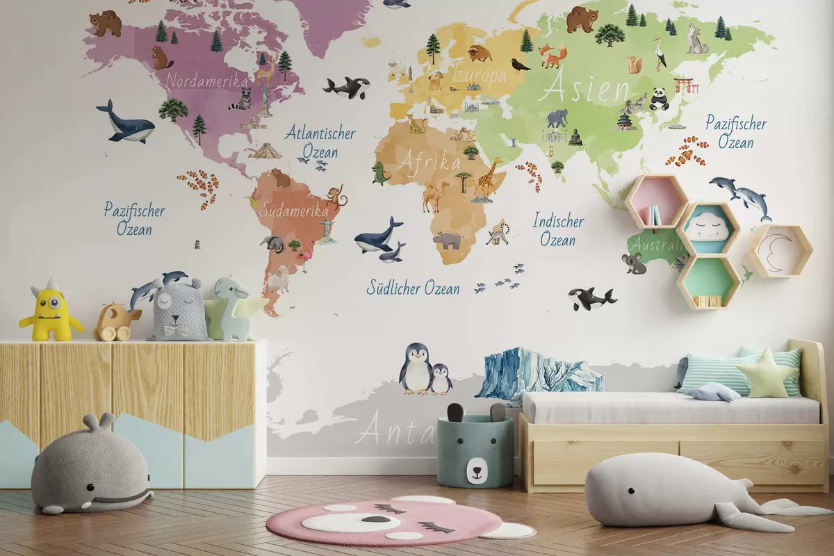 Fototapetes Akvareļa stilā veidota krāsaina karte, kurā attēloti dzīvnieki, augi un arhitektūra. Uzraksti vācu valodā Nr. c00009de