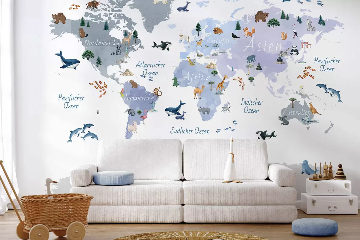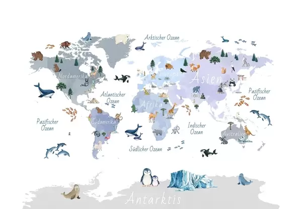 Fototapetes Zilā akvareļstilā veidota karte, kurā attēloti dzīvnieki, augi un arhitektūra. Uzraksti vācu valodā Nr. c00009dev1
