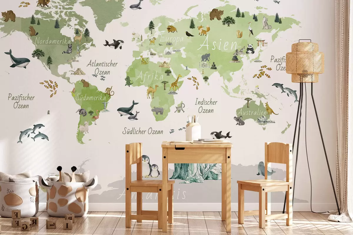Fototapetes Akvareļa stilā veidota zaļā karte, kurā attēloti dzīvnieki, augi un arhitektūra. Uzraksti vācu valodā Nr. c00009dev2