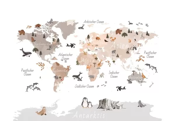 Fototapetes Akvareļa stilā veidota smilškrāsas karte, kurā attēloti dzīvnieki, augi un arhitektūra. Uzraksti vācu valodā Nr. c00009dev3