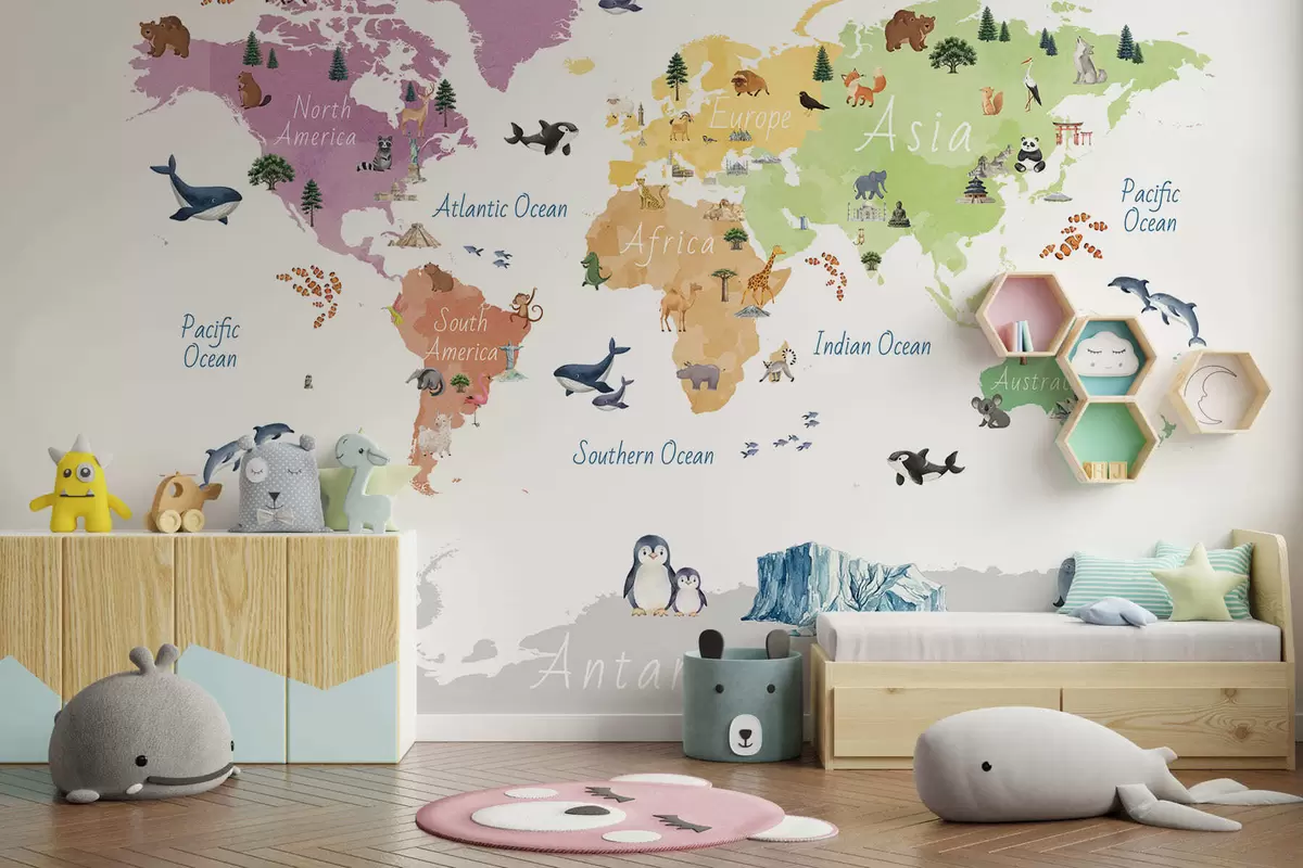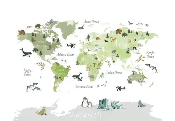 Fototapetes Akvareļa stilā veidota krāsaina karte, kurā attēloti dzīvnieki, augi un arhitektūra. Uzraksti angļu valodā Nr. c00009en