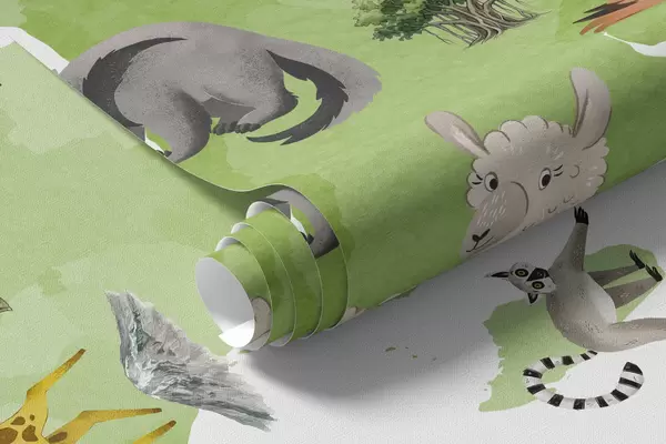 Fototapetes Akvareļa stilā veidota zaļā karte, kurā attēloti dzīvnieki, augi un arhitektūra. Uzraksti angļu valodā Nr. c00009env2