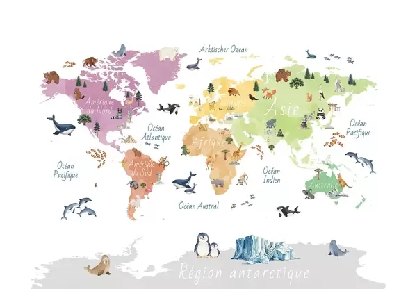 Fototapetes Akvareļa stilā veidota krāsaina karte, kurā attēloti dzīvnieki, augi un arhitektūra. Uzraksti franču valodā Nr. c00009fr