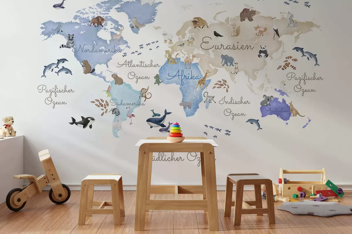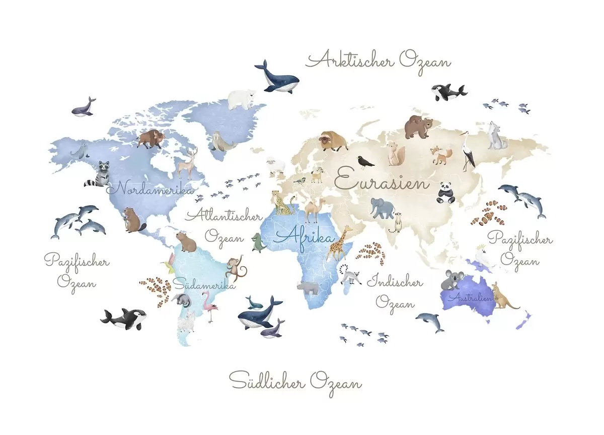 Fototapetes Zilā akvareļa stilā veidota karte ar dzīvniekiem. Uzraksti vācu valodā Nr. c00012dev1