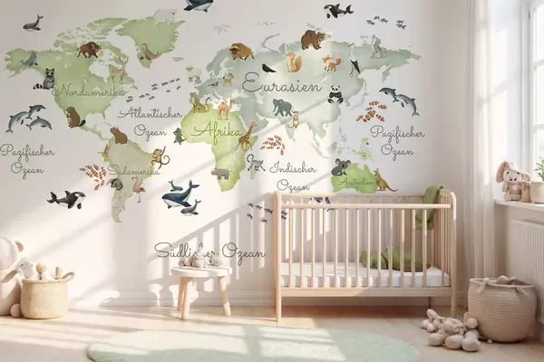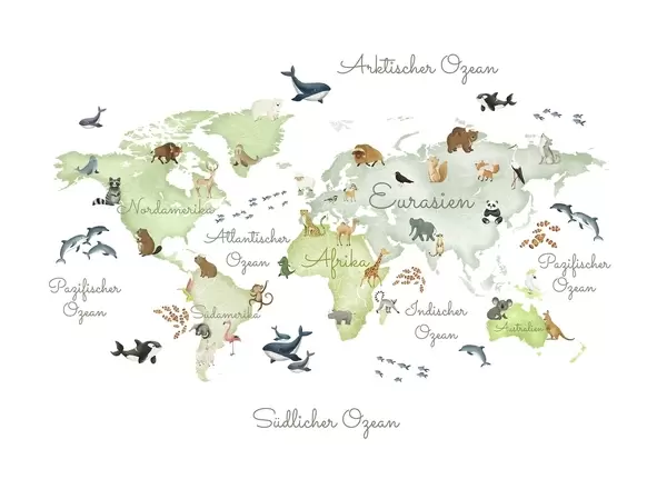 Fototapetes Akvareļa stilā veidota zaļā karte ar dzīvniekiem. Uzraksti vācu valodā Nr. c00012dev2