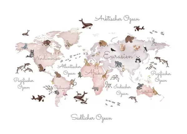 Fototapetes Akvareļa stilā veidota smilškrāsas karte ar dzīvniekiem. Uzraksti vācu valodā Nr. c00012dev3