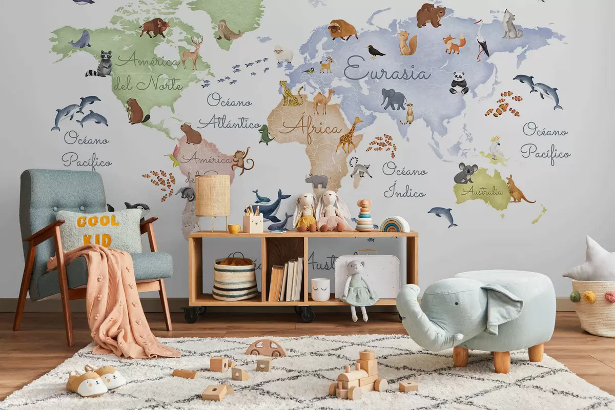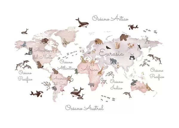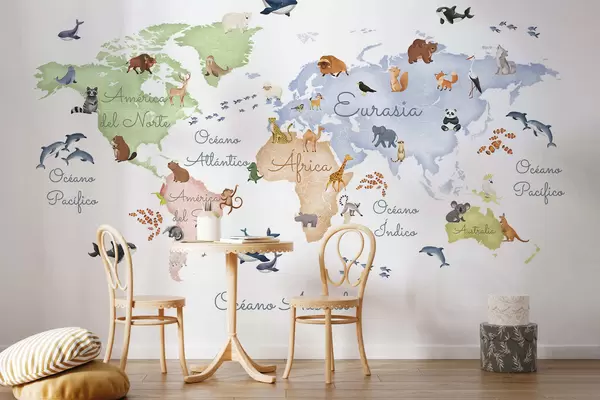 Fototapetes Akvareļa stilā veidota krāsaina karte ar dzīvniekiem. Uzraksti spāņu valodā Nr. c00012es