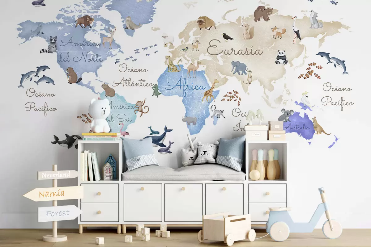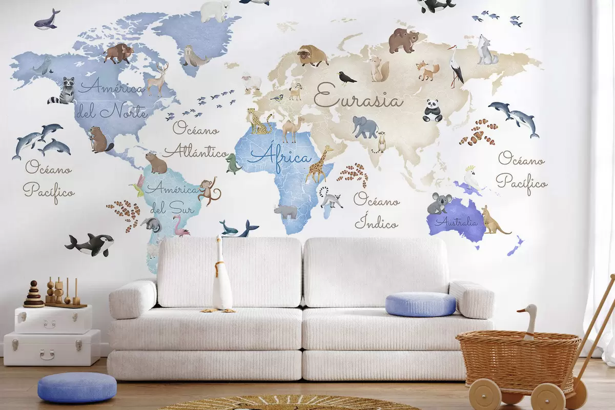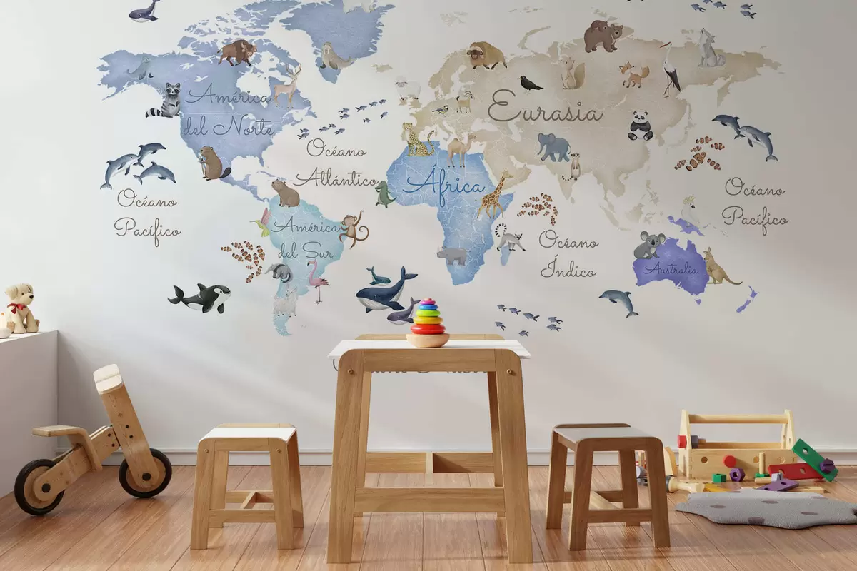 Fototapetes Zilā akvareļstilā veidota karte ar dzīvniekiem. Uzraksti spāņu valodā Nr. c00012esv1