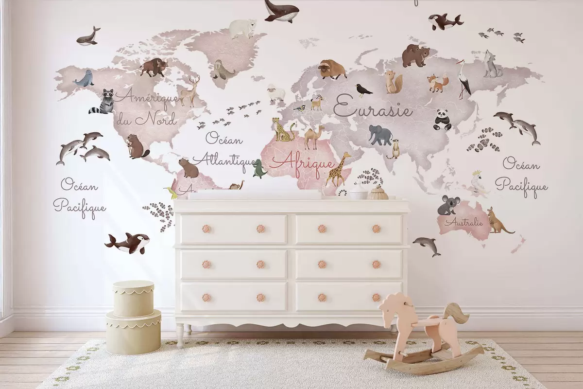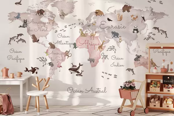 Fototapetes Akvareļa stilā veidota smilškrāsas karte ar dzīvniekiem. Uzraksti franču valodā Nr. c00012frv3
