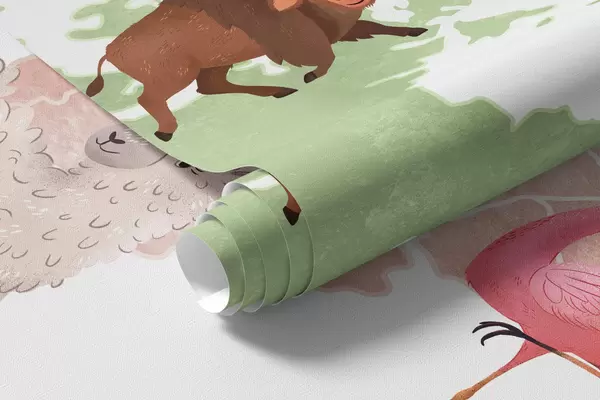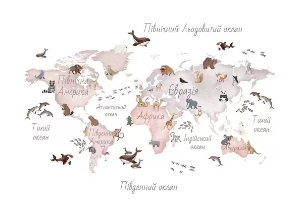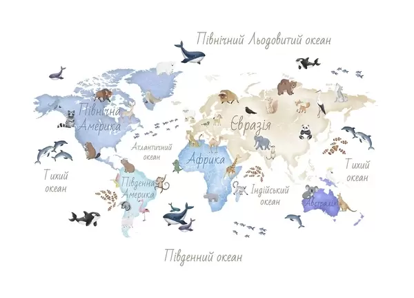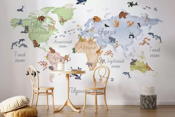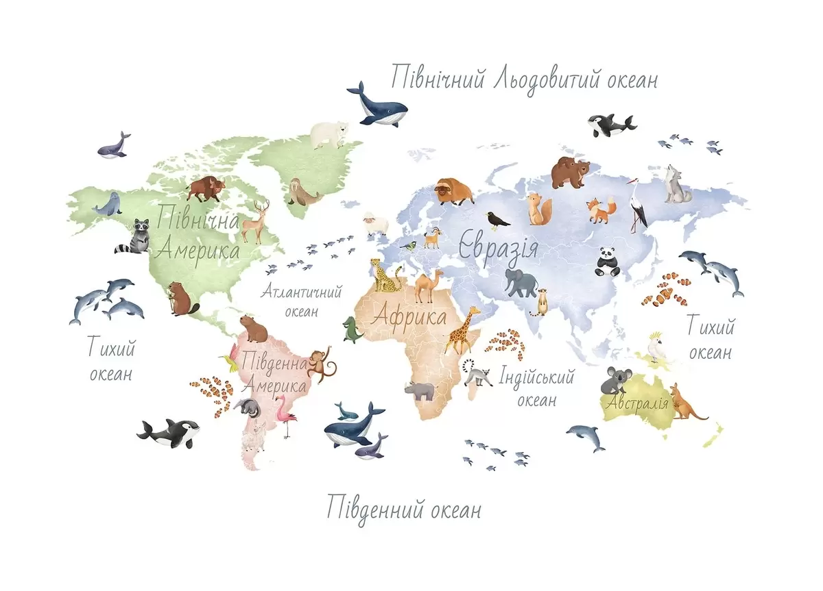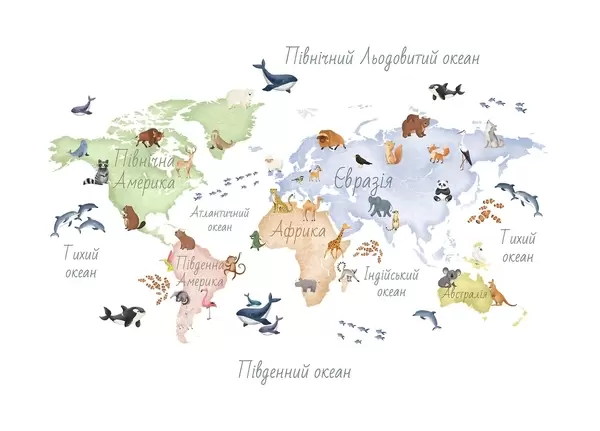 Fototapetes Akvareļa stilā veidota krāsaina karte ar dzīvniekiem. Uzraksti ukraiņu valodā Nr. c00012uk
