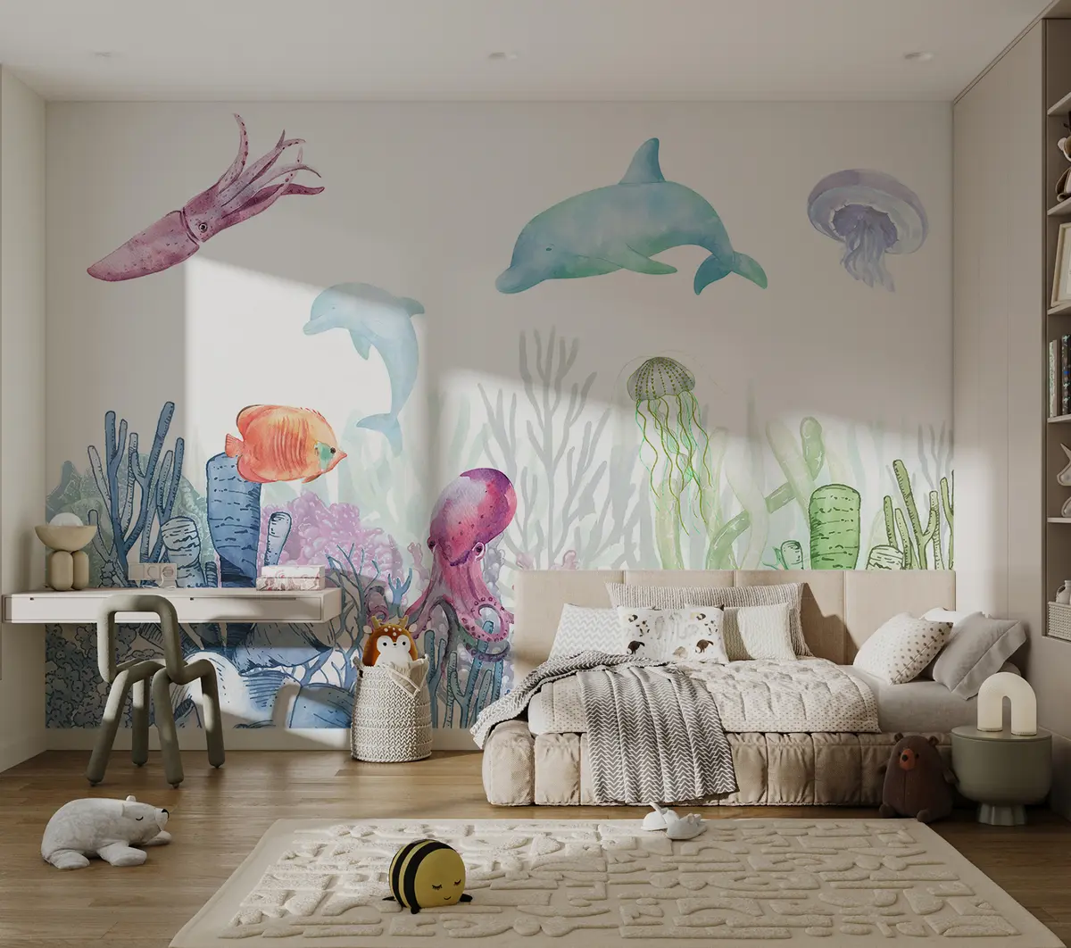 Fototapetes Zemūdens jūras dzīve, jūras dzīvnieki, akvarelis, koraļļi, delfīns, astoņkājis Nr. u98899