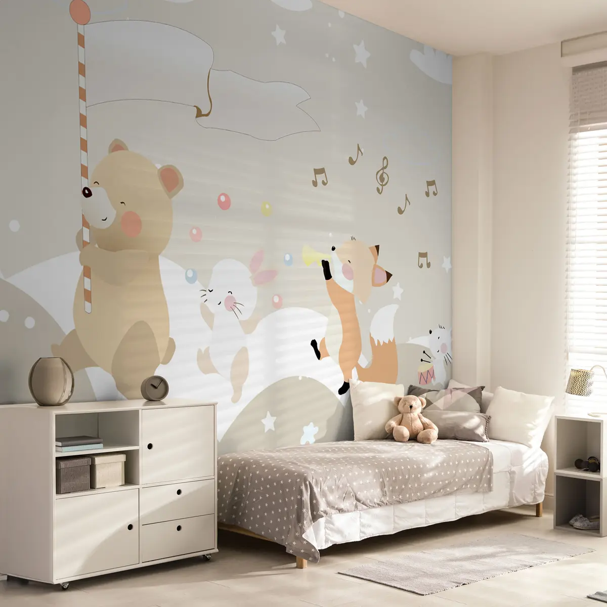 Fototapetes Tapetes dizains bērnu istabai ar mīļiem dzīvniekiem rozā krāsās Nr. u98969