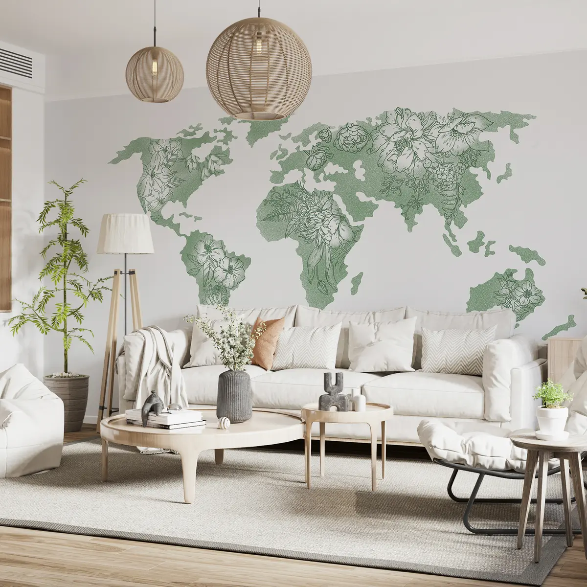 Fototapetes Pasaules ziedu karte, dekoratīvie, peonijas, lilija, zaļa krāsa, līniju zīmējums, māksla Nr. u99734v3