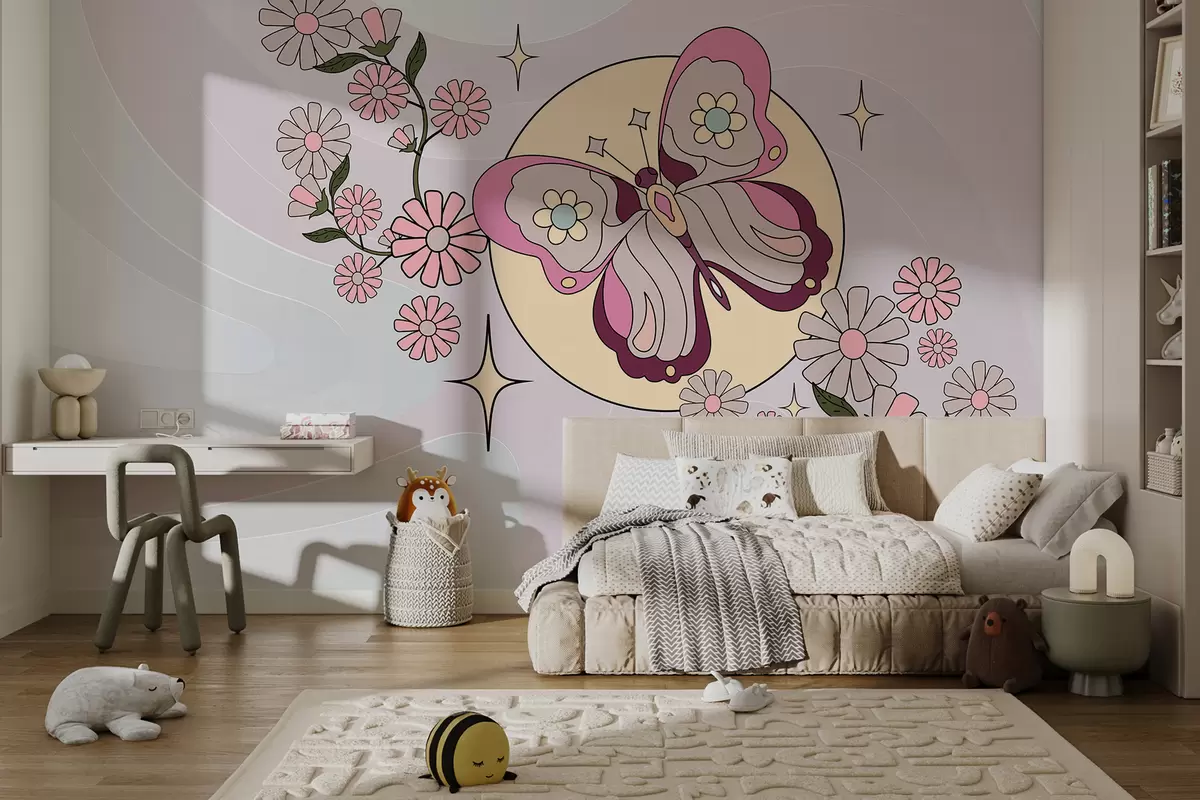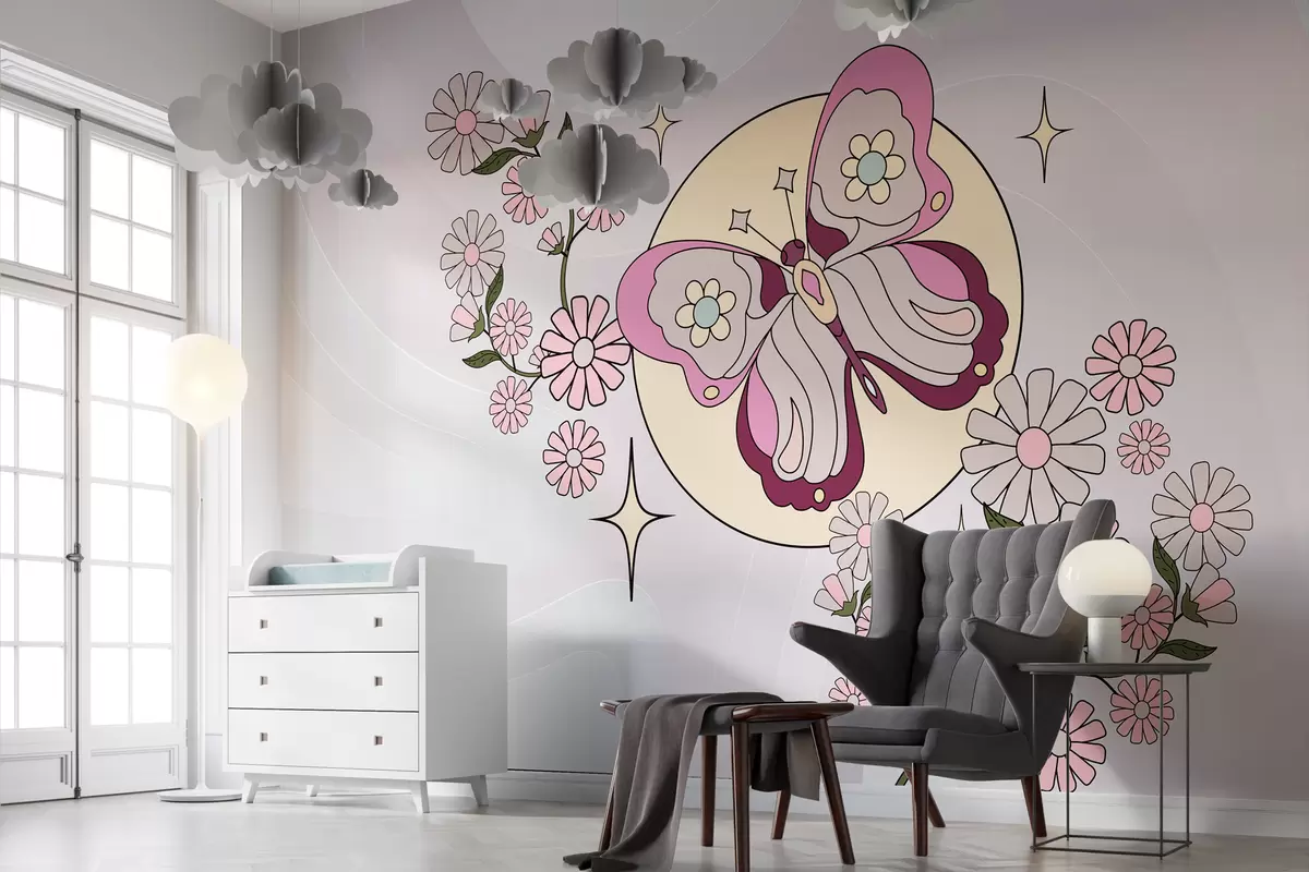 Fototapetes tapetes ar rozā tauriņu uz gaiši pelēcīgi rozā fona starp ziediem vienkāršā stilā meitenes istabai Nr. w00985