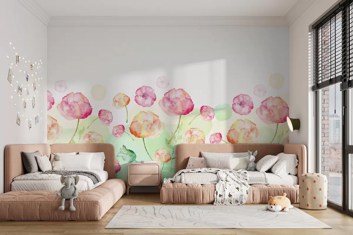 Fototapetes sarkanoranžas un rozā tulpes akvareļa tehnikā uz balta fona ar zaļiem traipiem Nr. w01028