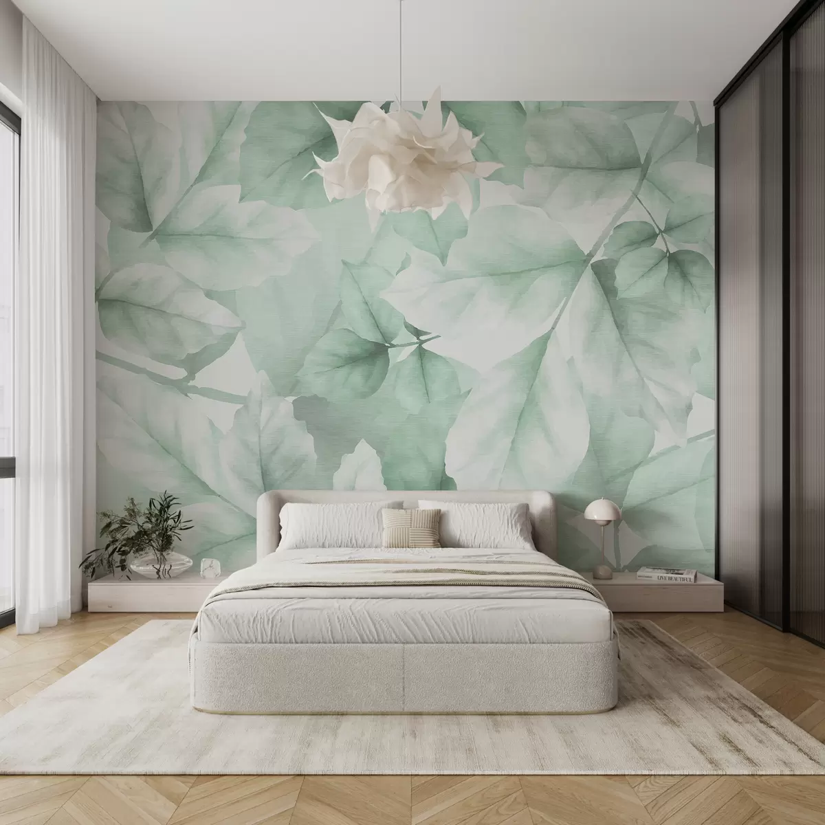Fototapetes Textured tapetes ar lielām lapām pasteļtoņos zaļā krāsā Nr. w01090v3