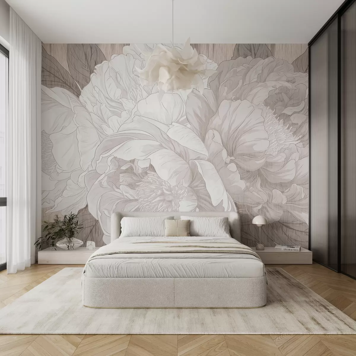 Fototapetes Lieli peoniju ziedi ar faktūru bēšos toņos w01141