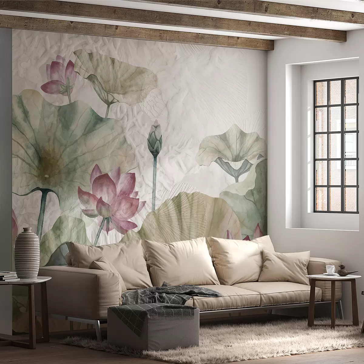 Fototapetes Rozā lotosa ziedi ar zaļām lapām uz gaišas tekstūras fona Nr. w01248